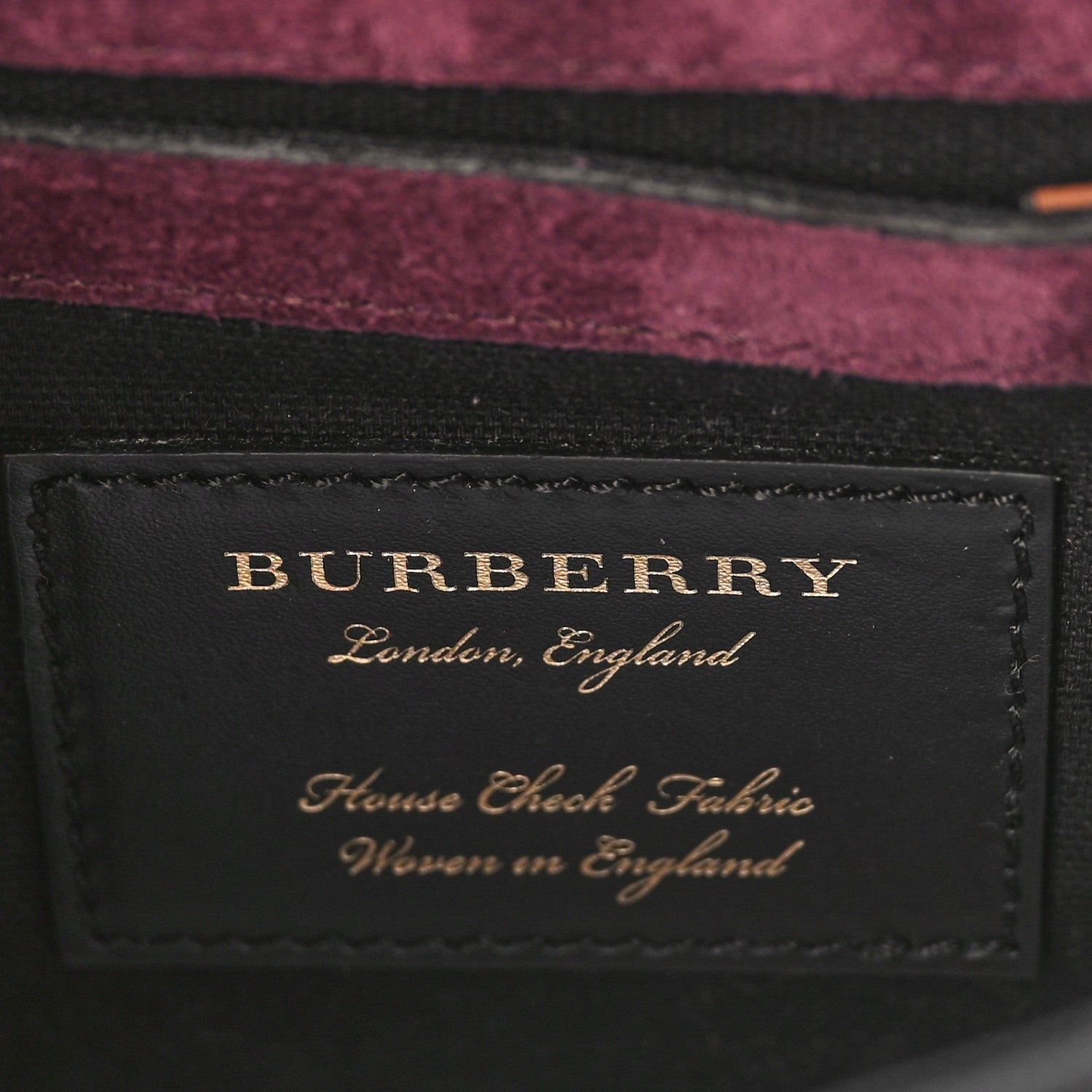 This is an authentic BURBERRY Derby Calfskin House Check Small Macken Crossbody Bag in Tan. This sleek crossbody shoulder bag is crafted of brown textured leather and checked canvas in a structured design with a front slip pocket, a rigid base, and polished gold hardware accents. The front flap opens to purple suede leather and black fabric interior with a patch pocket.Follow this item for alerts. Burberry is a registered trademark of Burberry. FASHIONPHILE is not affiliated with Burberry.