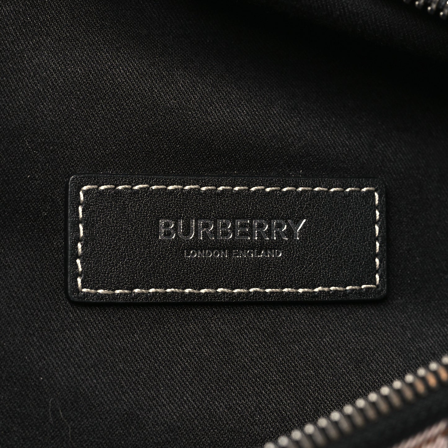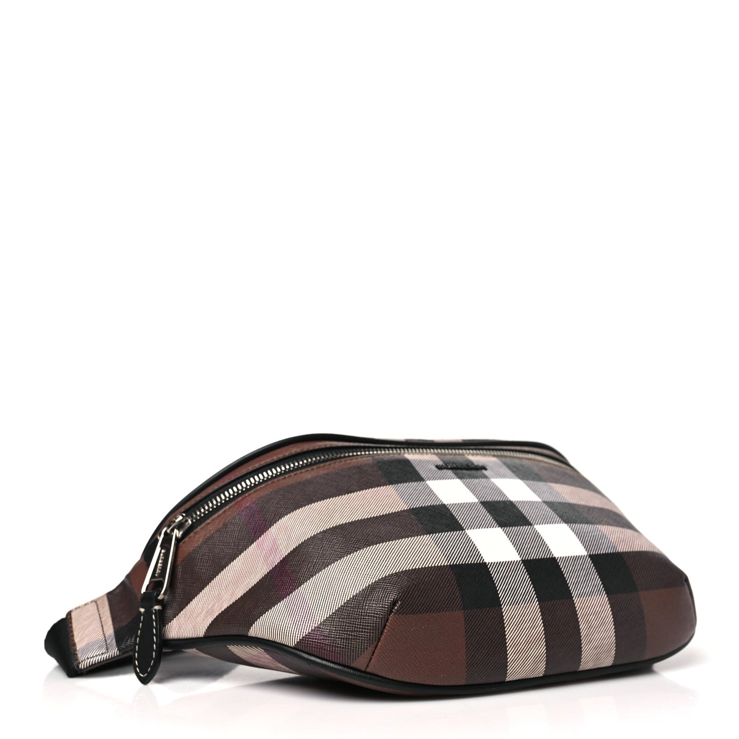 This is an authentic BURBERRY E-canvas Check Cason Bum Bag in Dark Birch Brown. This bag is crafted of brown check coated canvas, black leather trim, and silver hardware. The top opens to a black fabric interior.Follow this item for alerts. Burberry is a registered trademark of Burberry. FASHIONPHILE is not affiliated with Burberry.