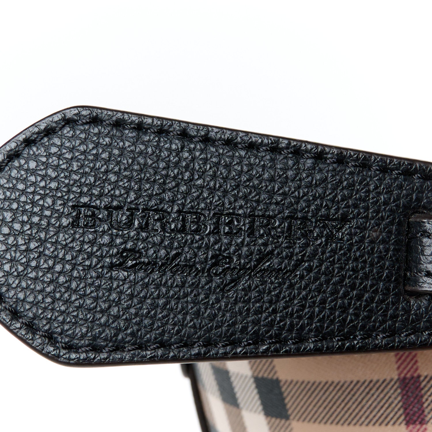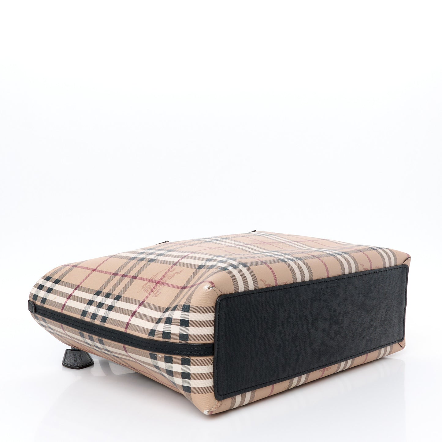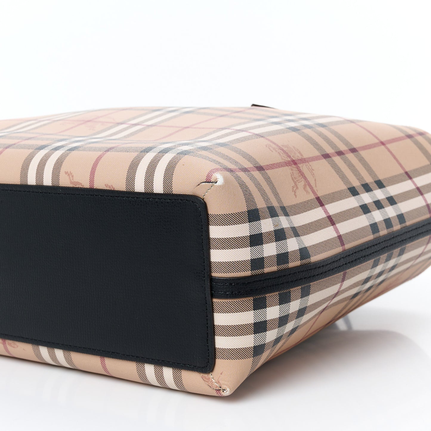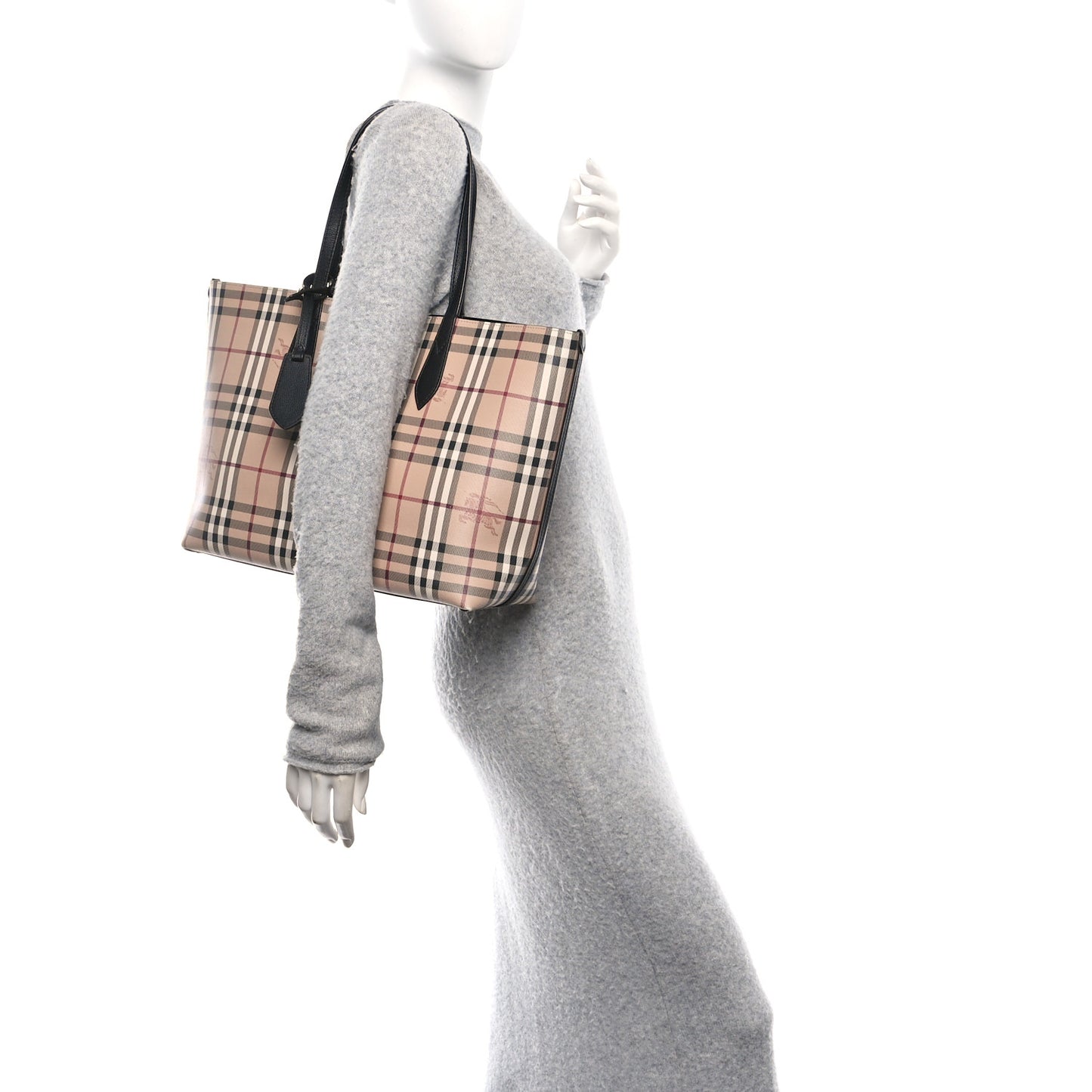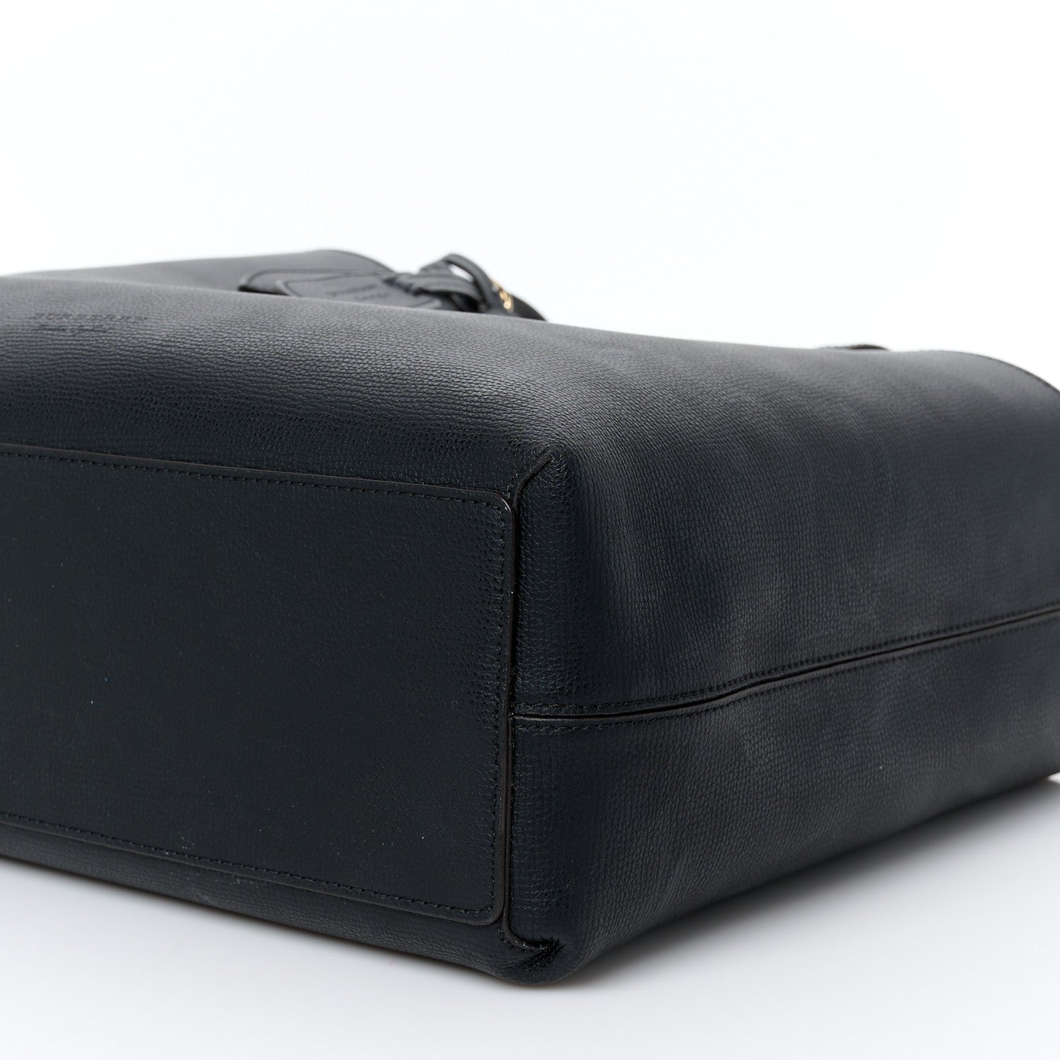 This is an authentic BURBERRY Grainy Calfskin Haymarket Check Medium Reversible Tote in Black. This stylish tote is crafted of grained calfskin leather in black. The bag features matching leather shoulder straps and a removable Burberry logo charm. The top is open to a reversible Burberry Haymarket check coated canvas lining.Follow this item for alerts. Burberry is a registered trademark of Burberry. FASHIONPHILE is not affiliated with Burberry.