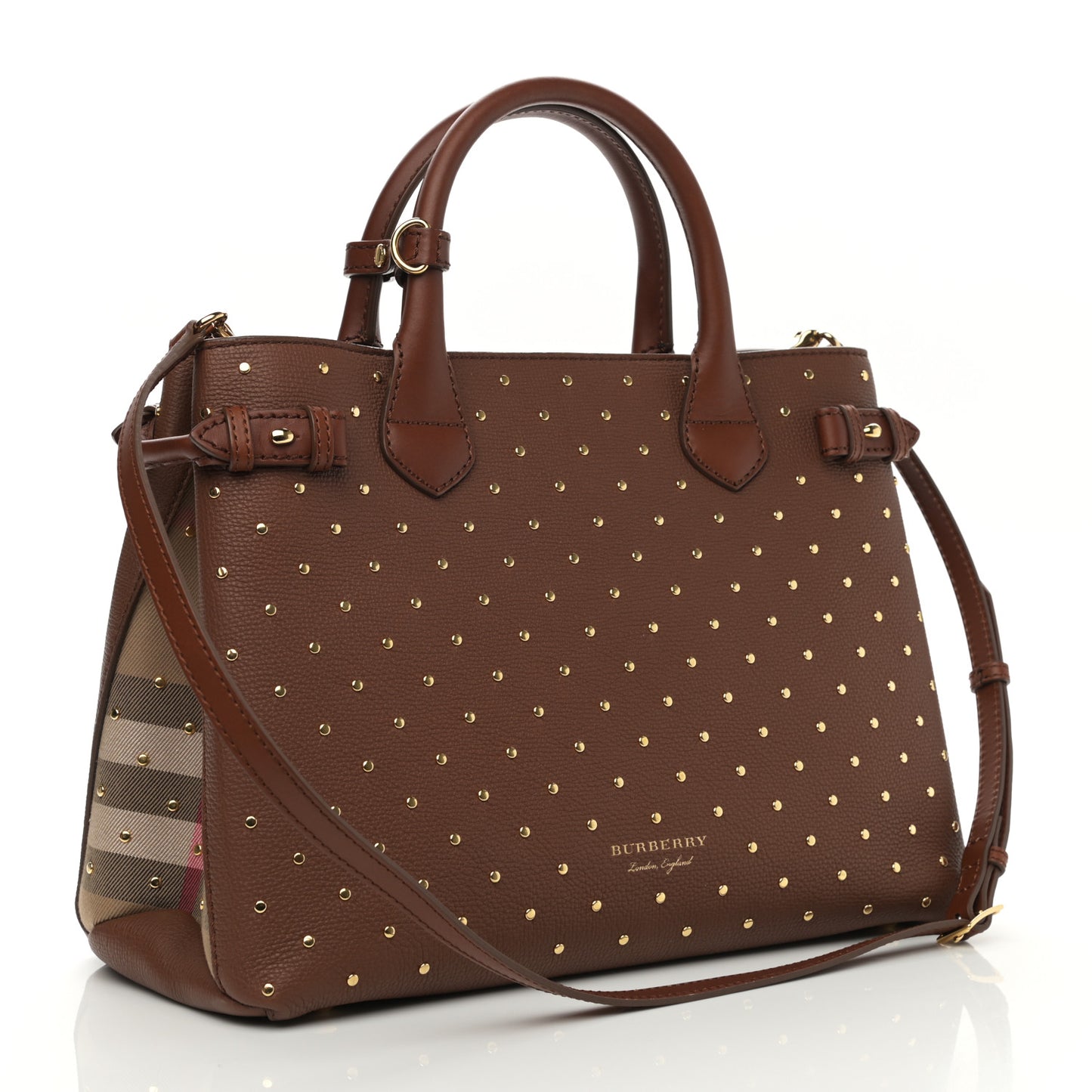 This is an authentic BURBERRY Grainy Calfskin Studded Medium Banner Tote in Tan. This stylish tote is crafted of finely grained calfskin leather in brown with a Burberry check insert on the sides. The bag features rolled leather top handles, leather side belts, gold studs throughout, and an optional cross body shoulder strap with brass clasps. The interior is lined with black canvas with a central zipper compartment.Follow this item for alerts. Burberry is a registered trademark of Burberry. FASHIONPHILE is not affiliated with Burberry.