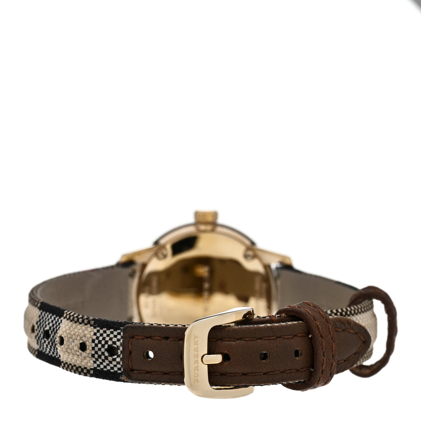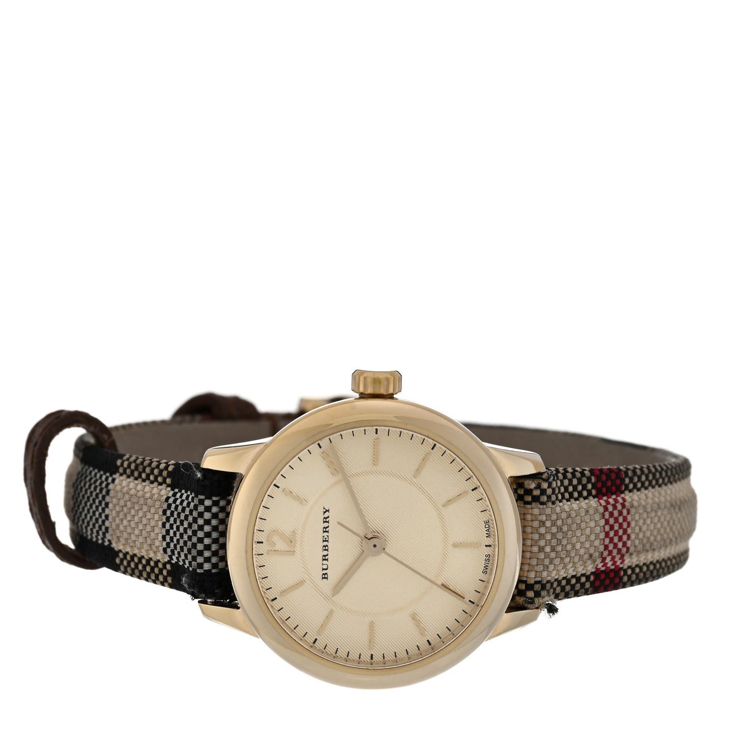 This is an authentic BURBERRY Stainless Steel Calfskin 26mm Classic Quartz Watch Champagne BU10201. The watch is crafted of stainless steel and features a champagne dial, gold hands and hour markers, checked calfskin strap, sapphire crystal, and a quartz movement.Follow this item for alerts. Burberry is a registered trademark of Burberry. FASHIONPHILE is not affiliated with Burberry.