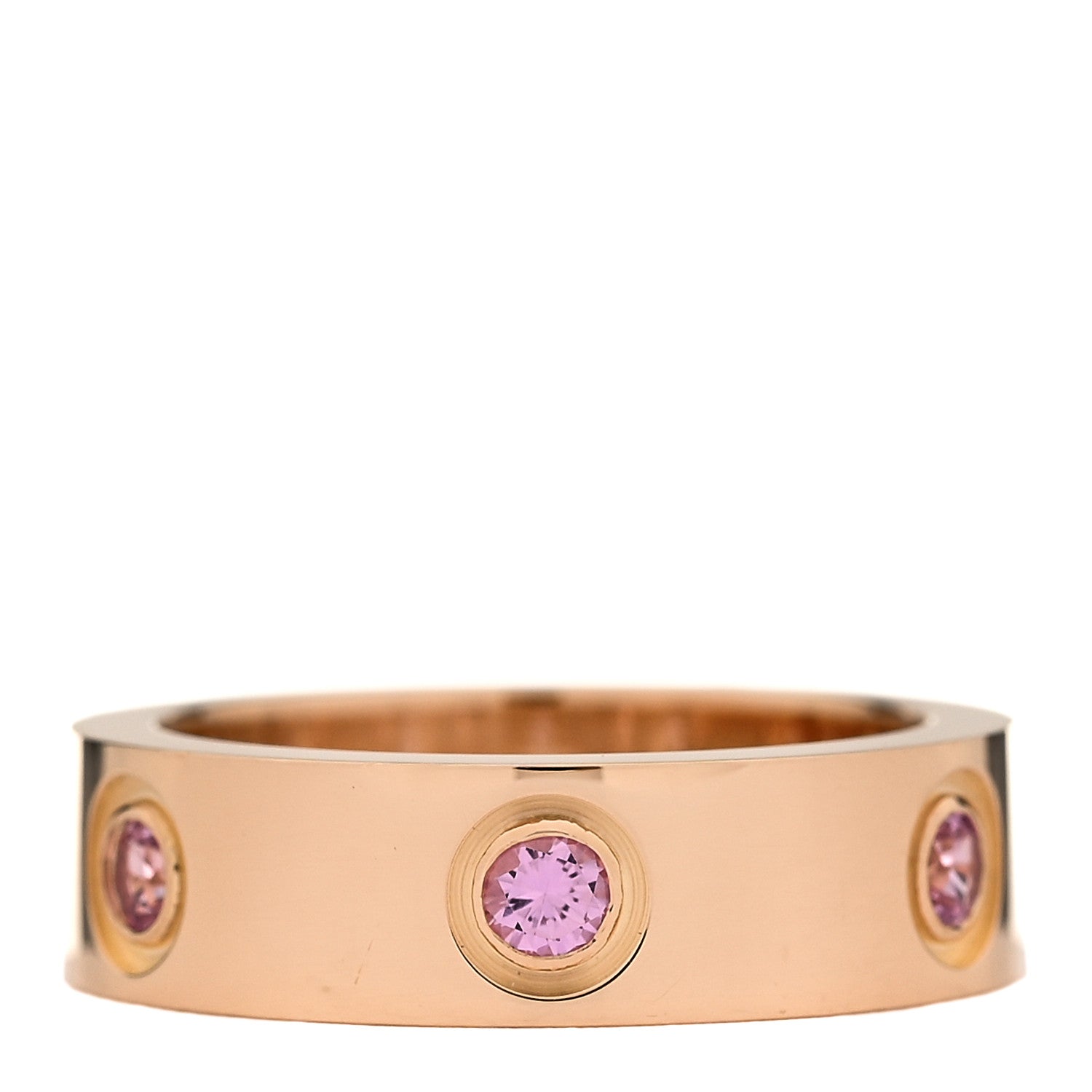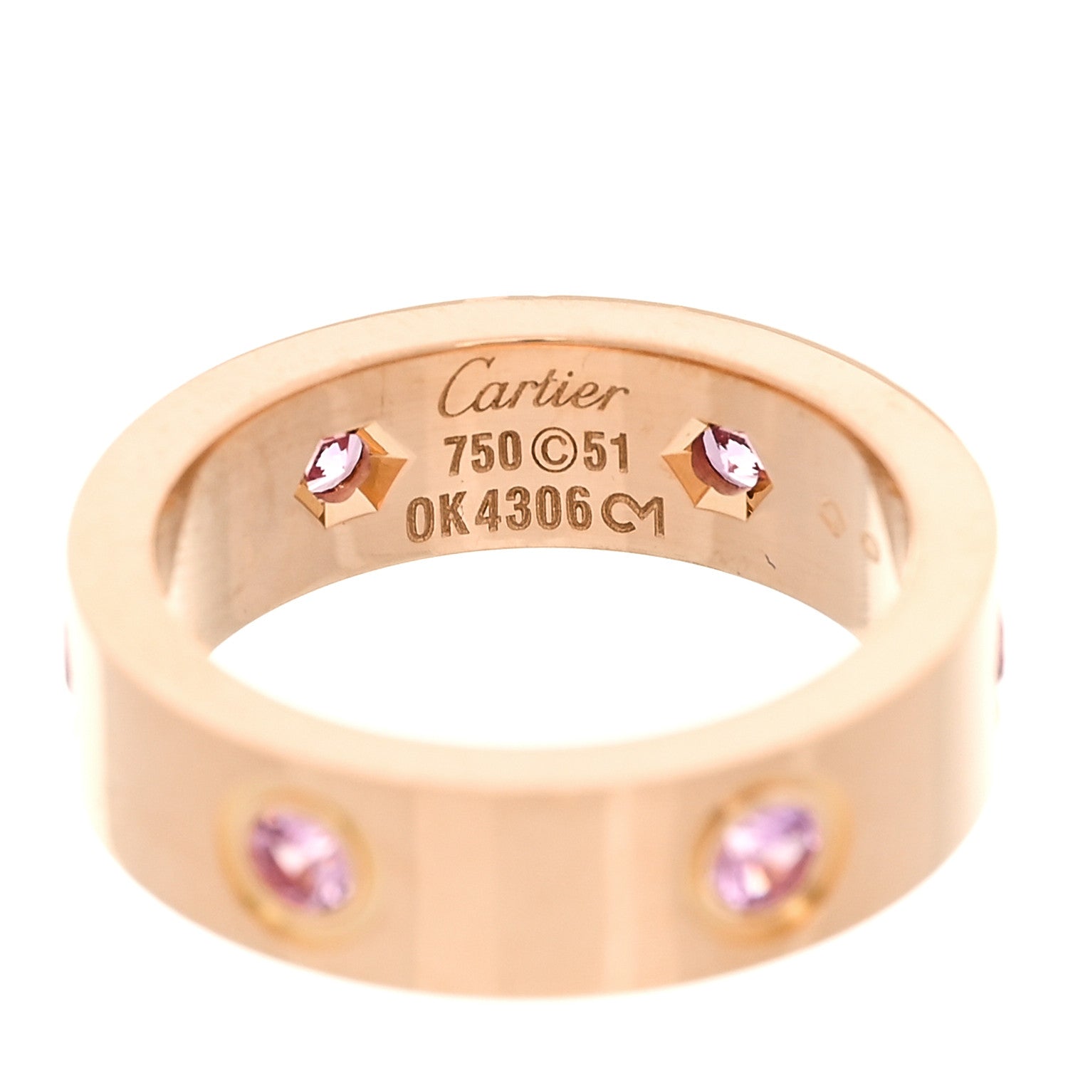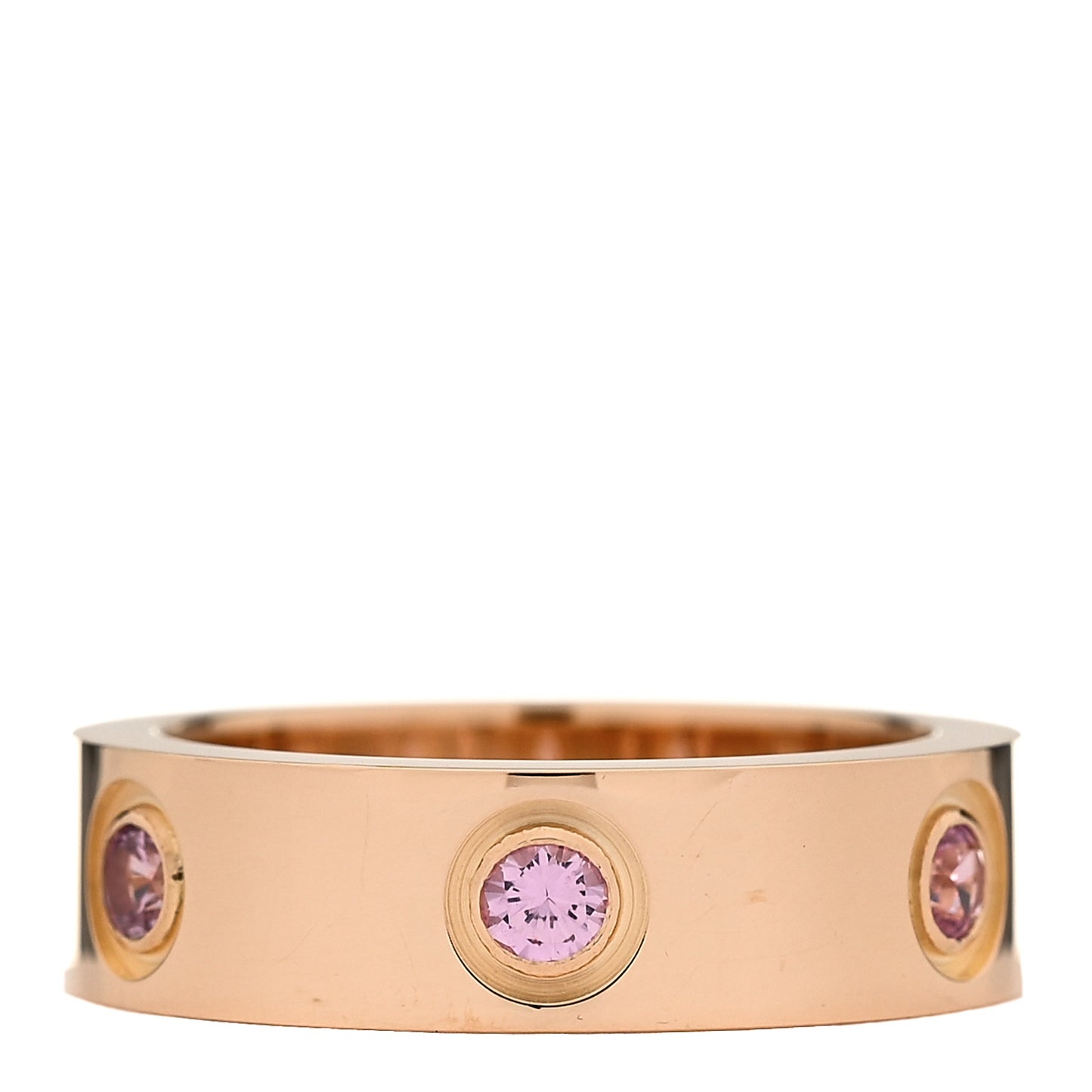 This is an authentic CARTIER 18K Pink Gold 6 Pink Sapphire 5.5mm LOVE Ring size 51 or 5.75. The ring is crafted of 18 karat pink gold and features six bezel-set pink sapphires.Follow this item for alerts. Cartier is a registered trademark of Cartier. FASHIONPHILE is not affiliated with Cartier.