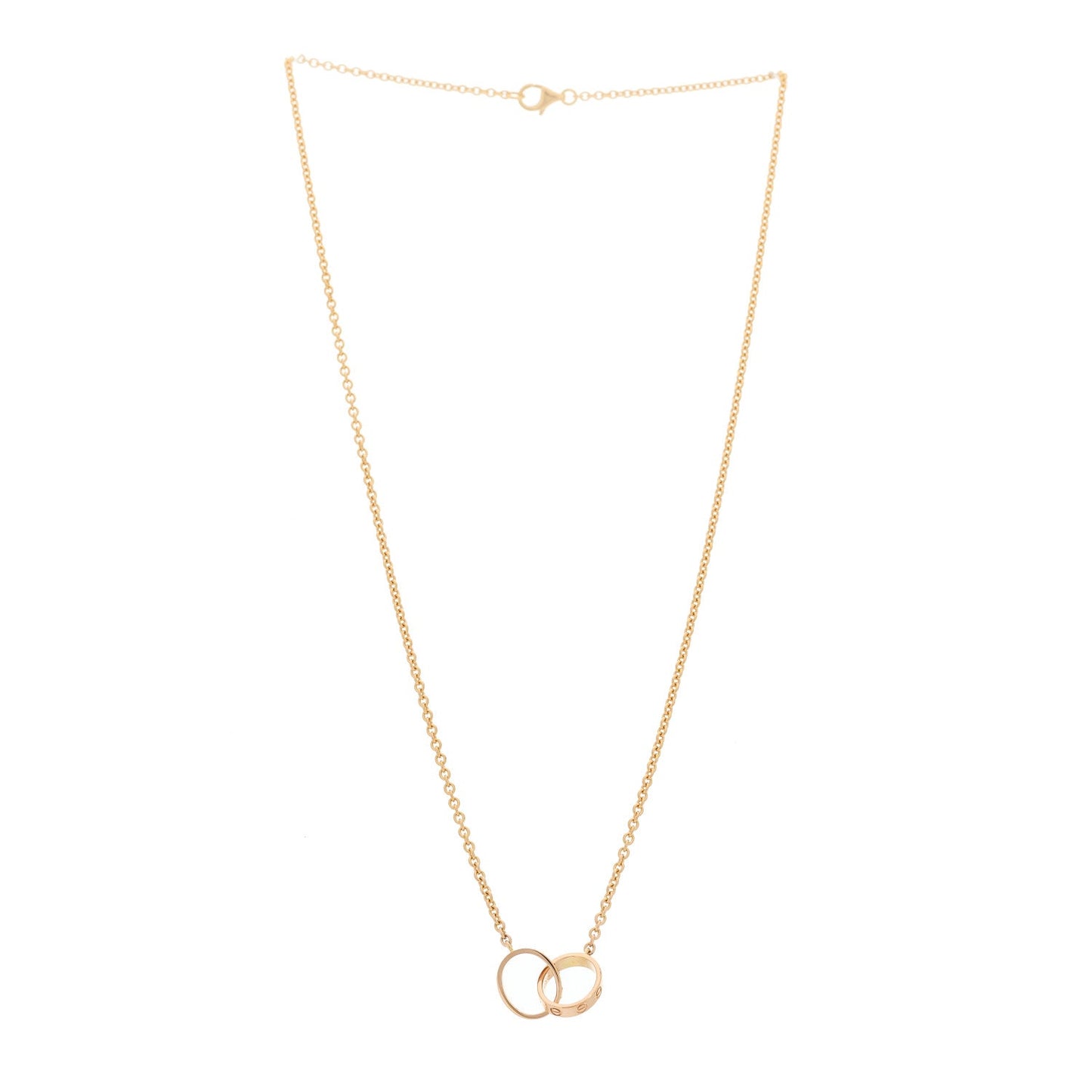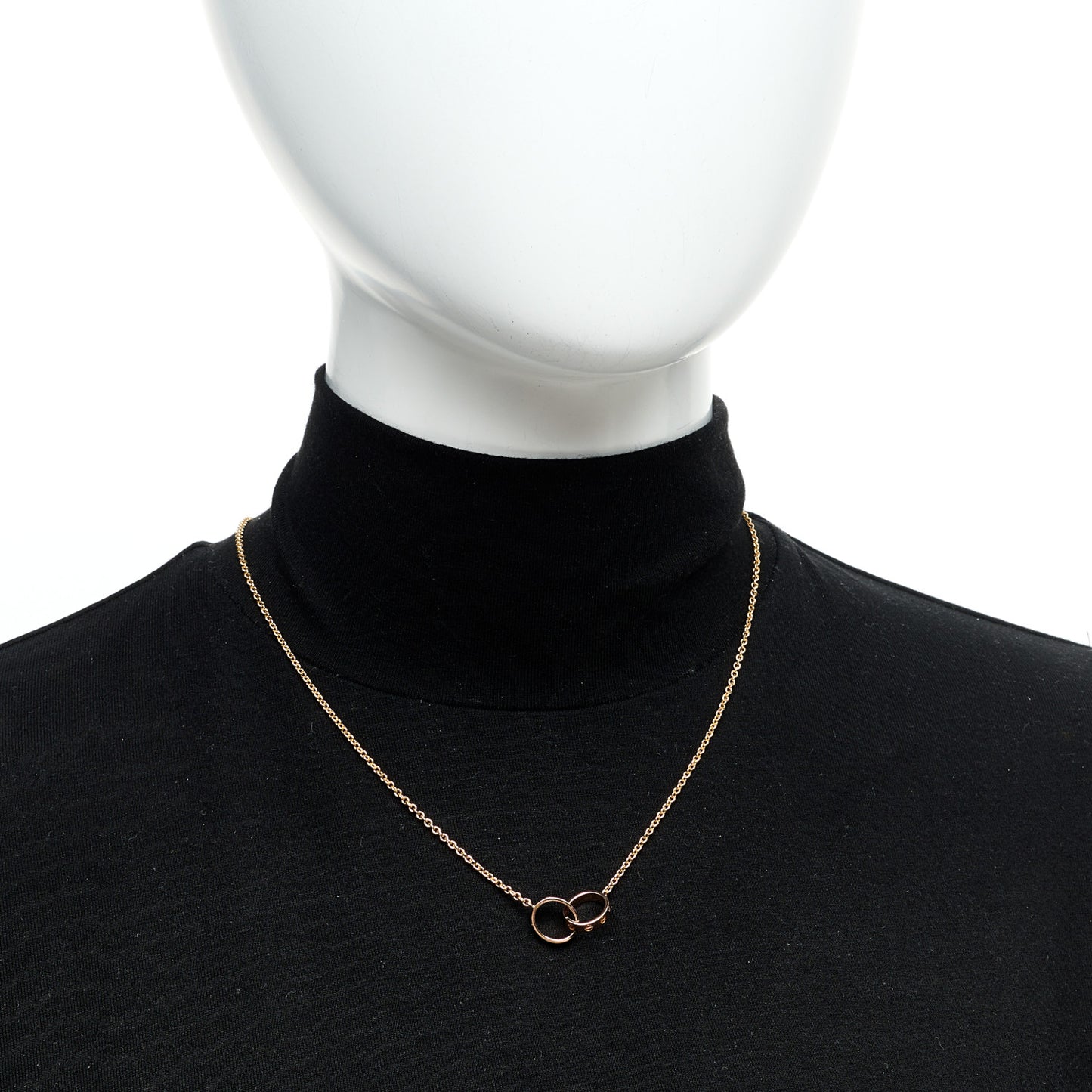 This is an authentic CARTIER 18K Pink Gold Interlocking LOVE Necklace. The necklace is crafted of 18 karat pink gold and features two interlocking rings with the signature Cartier LOVE screw symbol motifs engraved throughout the bands.Follow this item for alerts. Cartier is a registered trademark of Cartier. FASHIONPHILE is not affiliated with Cartier.