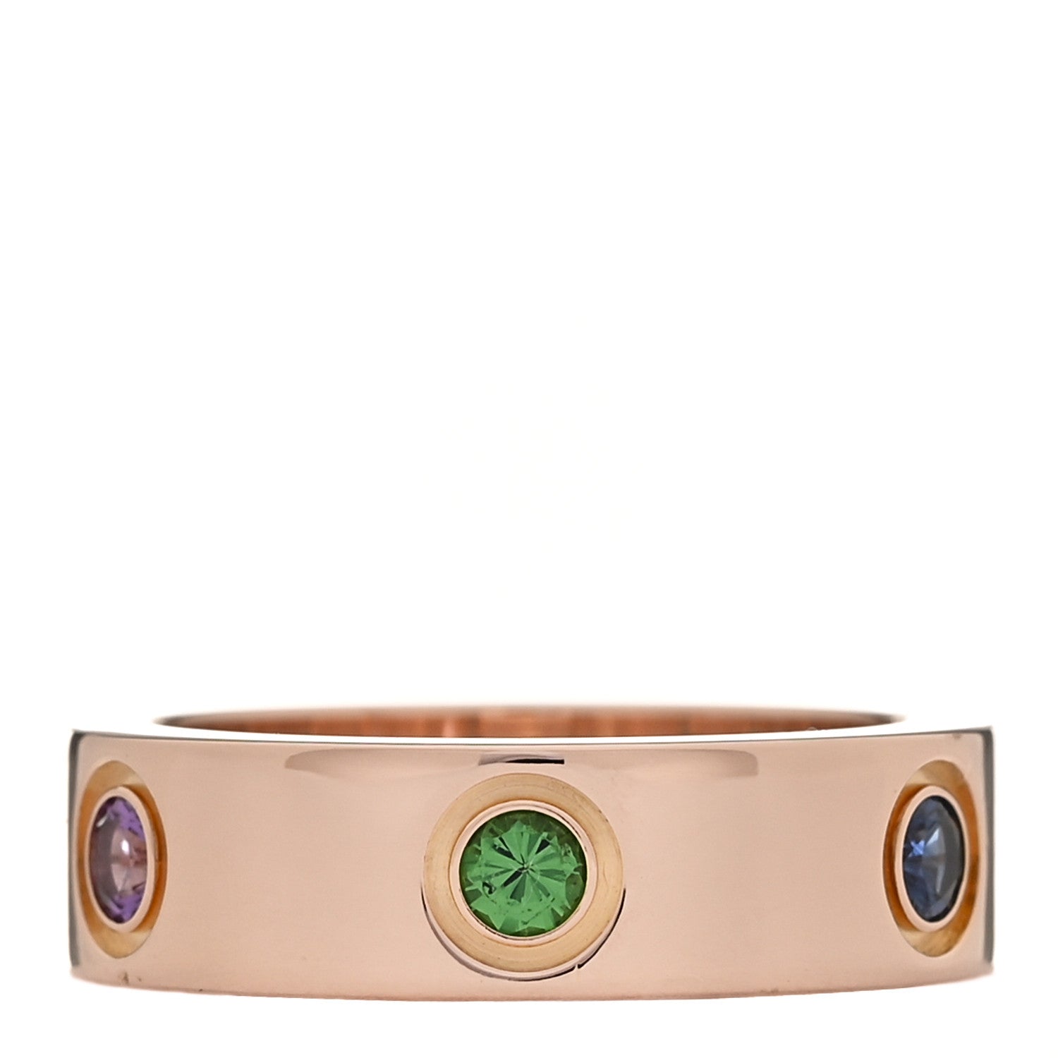 This is an authentic CARTIER 18K Pink Gold Sapphire Garnet Amethyst 5.5mm LOVE Ring 52 or 6. The ring is crafted of 18 karat pink gold and features pink, blue and yellow sapphires, a green and orange garnet and an amethyst bezel-set throughout the band.Follow this item for alerts. Cartier is a registered trademark of Cartier. FASHIONPHILE is not affiliated with Cartier.