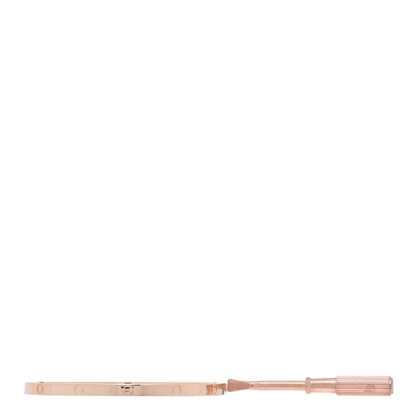 This is an authentic CARTIER 18K Pink Gold Small LOVE Bracelet size 17. The bracelet is crafted of 18 karat pink gold and features the signature LOVE screw motifs engraved throughout the bangle.Follow this item for alerts. Cartier is a registered trademark of Cartier. FASHIONPHILE is not affiliated with Cartier.