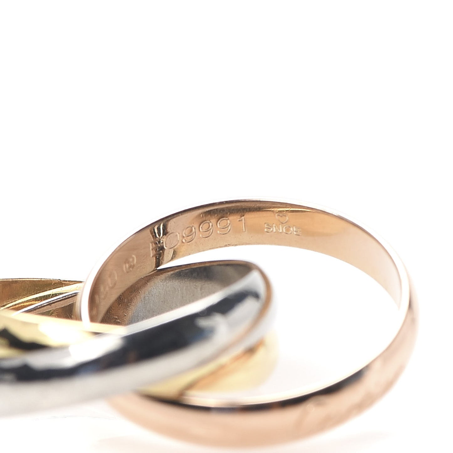 This is an authentic CARTIER 18K Pink Yellow White Gold Classic Trinity Ring size 50 or 5.25. The ring is crafted of three interlocking polished bands of 18 karat pink, yellow, and white gold.Follow this item for alerts. Cartier is a registered trademark of Cartier. FASHIONPHILE is not affiliated with Cartier.