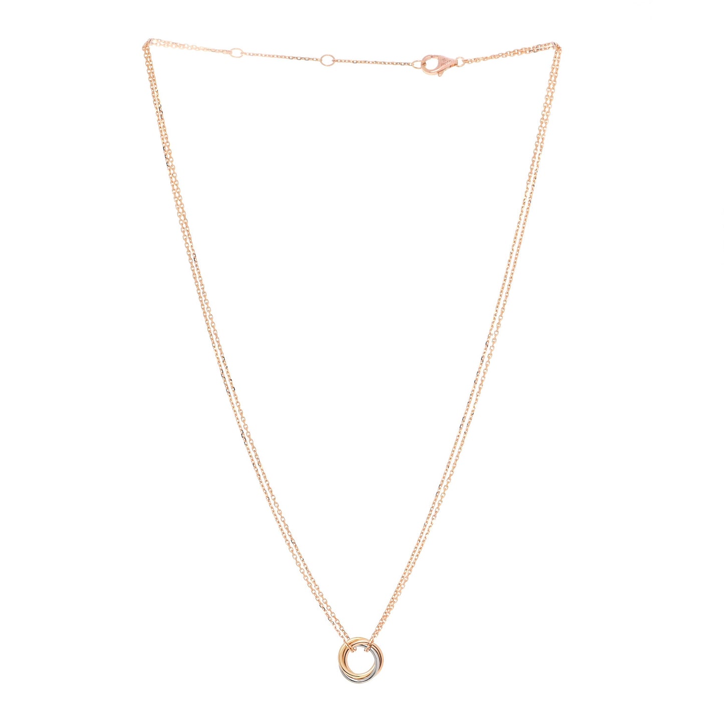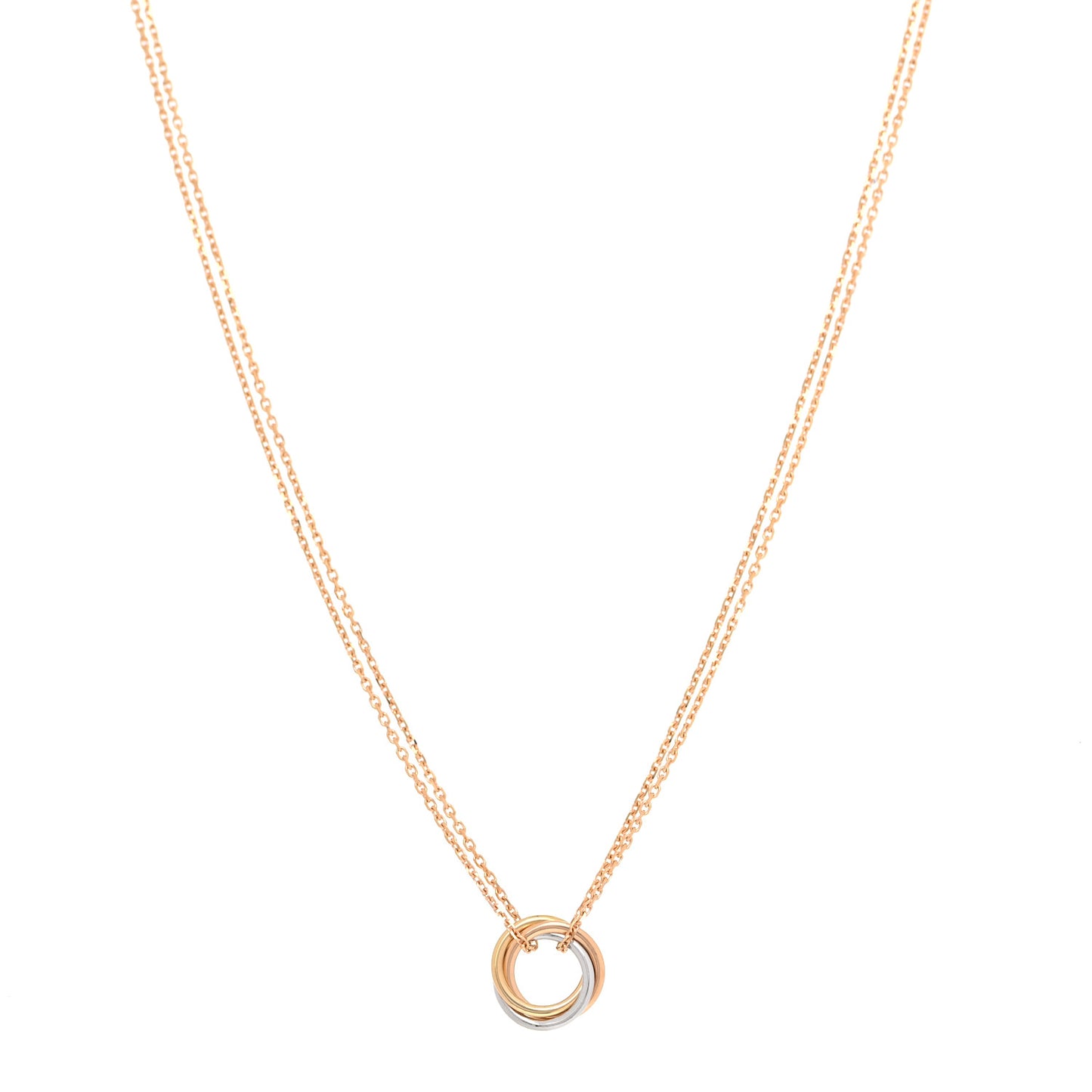 This is an authentic CARTIER 18K Pink Yellow White Gold Trinity Double Chain Pendant Necklace. The necklace is crafted of an 18 karat yellow gold chain holding three interlocked rings of pink, yellow, and white gold.Follow this item for alerts. Cartier is a registered trademark of Cartier. FASHIONPHILE is not affiliated with Cartier.