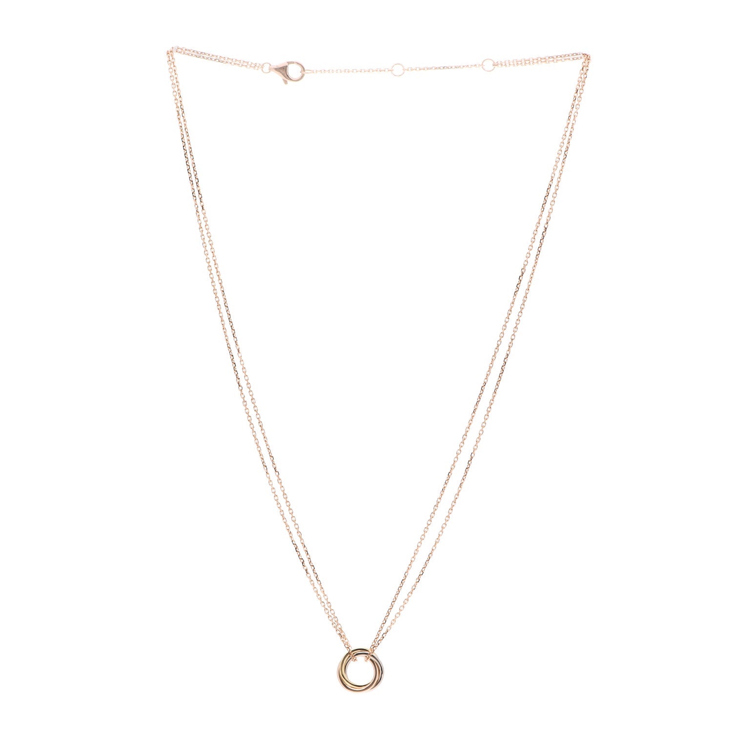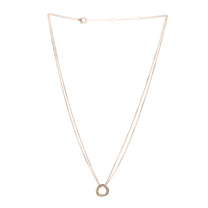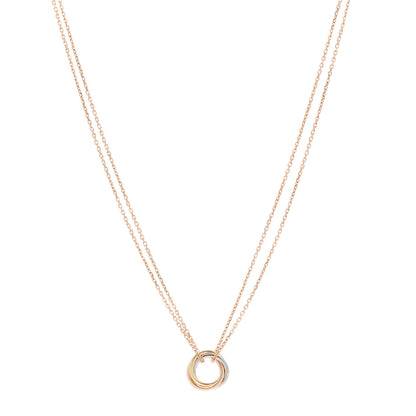 This is an authentic CARTIER 18K Pink Yellow White Gold Trinity Double Chain Pendant Necklace. The necklace is crafted of 18 karat pink, white, and yellow gold and features a pink gold chain and three interlocking rings.Follow this item for alerts. Cartier is a registered trademark of Cartier. FASHIONPHILE is not affiliated with Cartier.