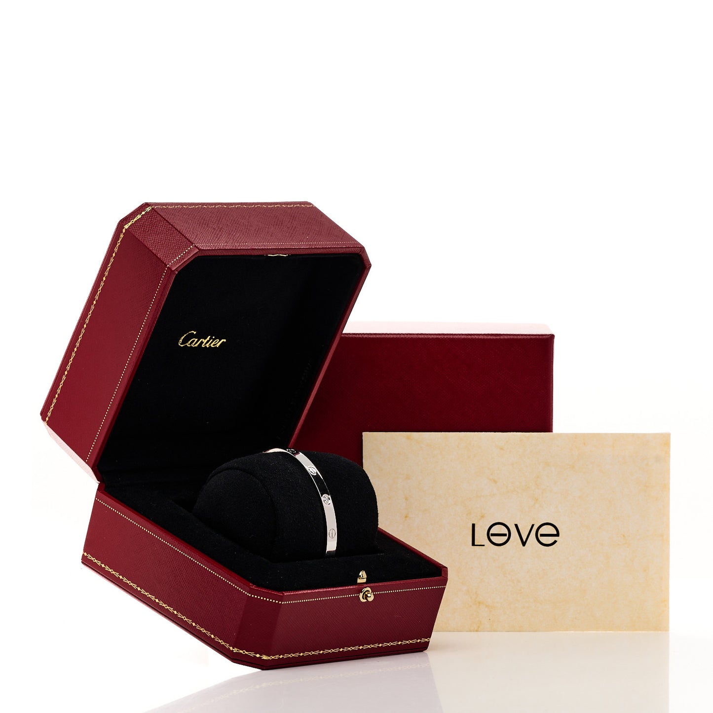This is an authentic CARTIER 18K White Gold 1 Diamond LOVE Cuff Bracelet size 18. The bracelet is crafted of 18 karat white gold and features the signature screw symbol motif and a central round brilliant cut diamond approximately weighing .10 carat.Follow this item for alerts. Cartier is a registered trademark of Cartier. FASHIONPHILE is not affiliated with Cartier.