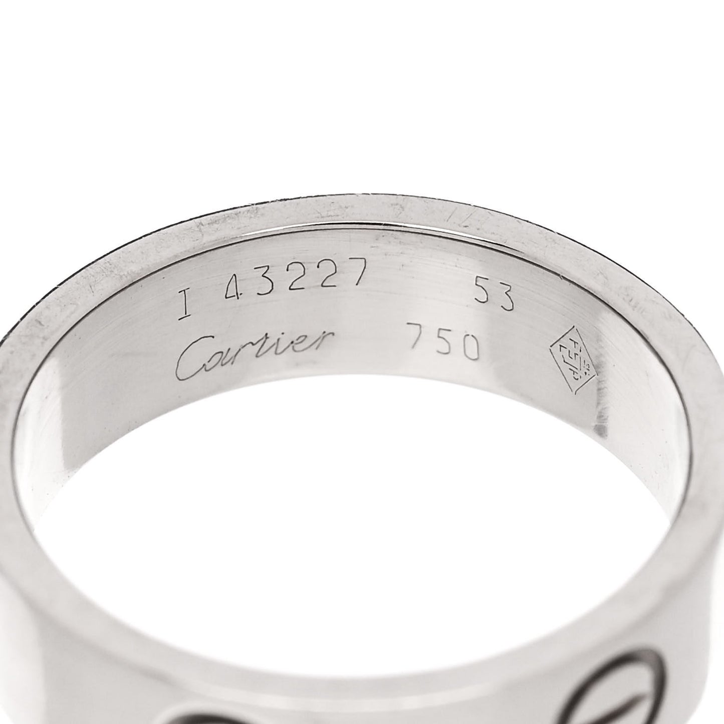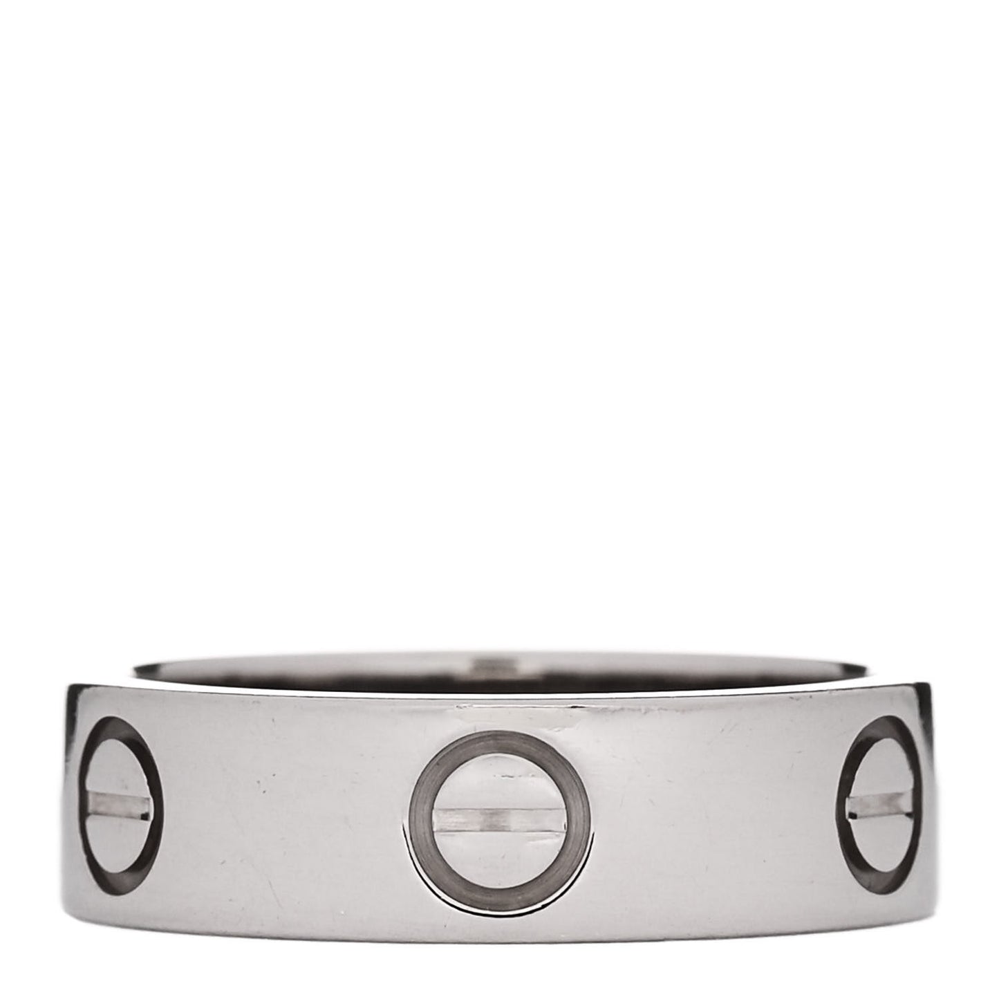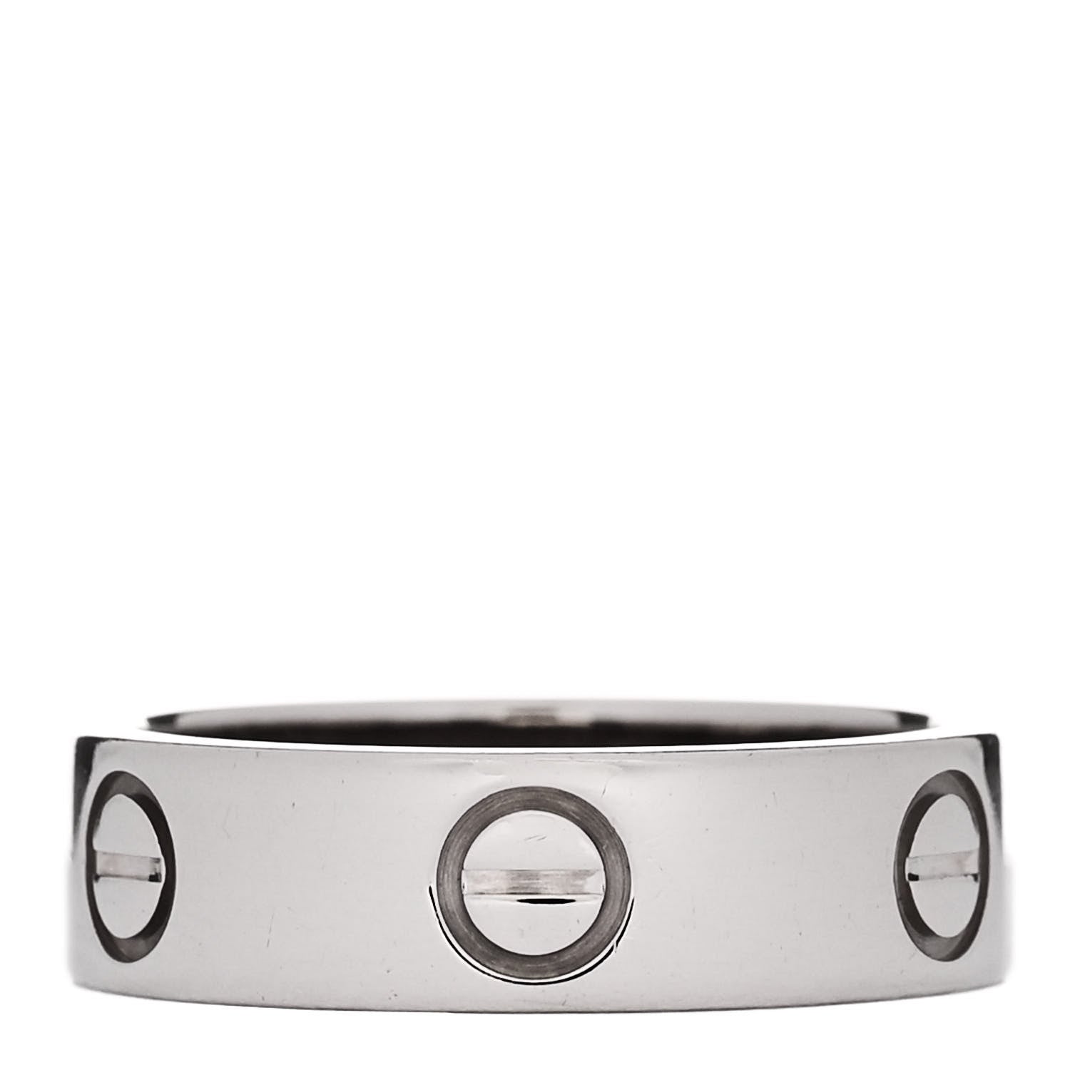 This is an authentic CARTIER 18K White Gold 5.5mm LOVE Ring size 53 or 6.5. The ring is crafted of 18 karat white gold and features the engraved LOVE symbol motifs throughout the band.Follow this item for alerts. Cartier is a registered trademark of Cartier. FASHIONPHILE is not affiliated with Cartier.