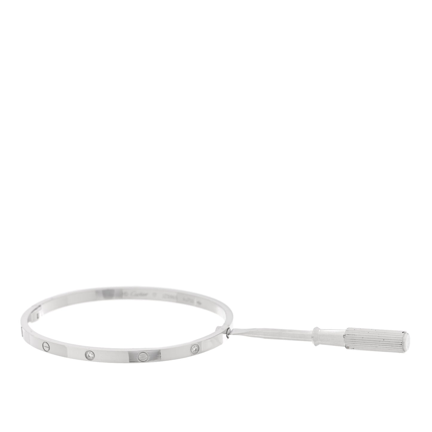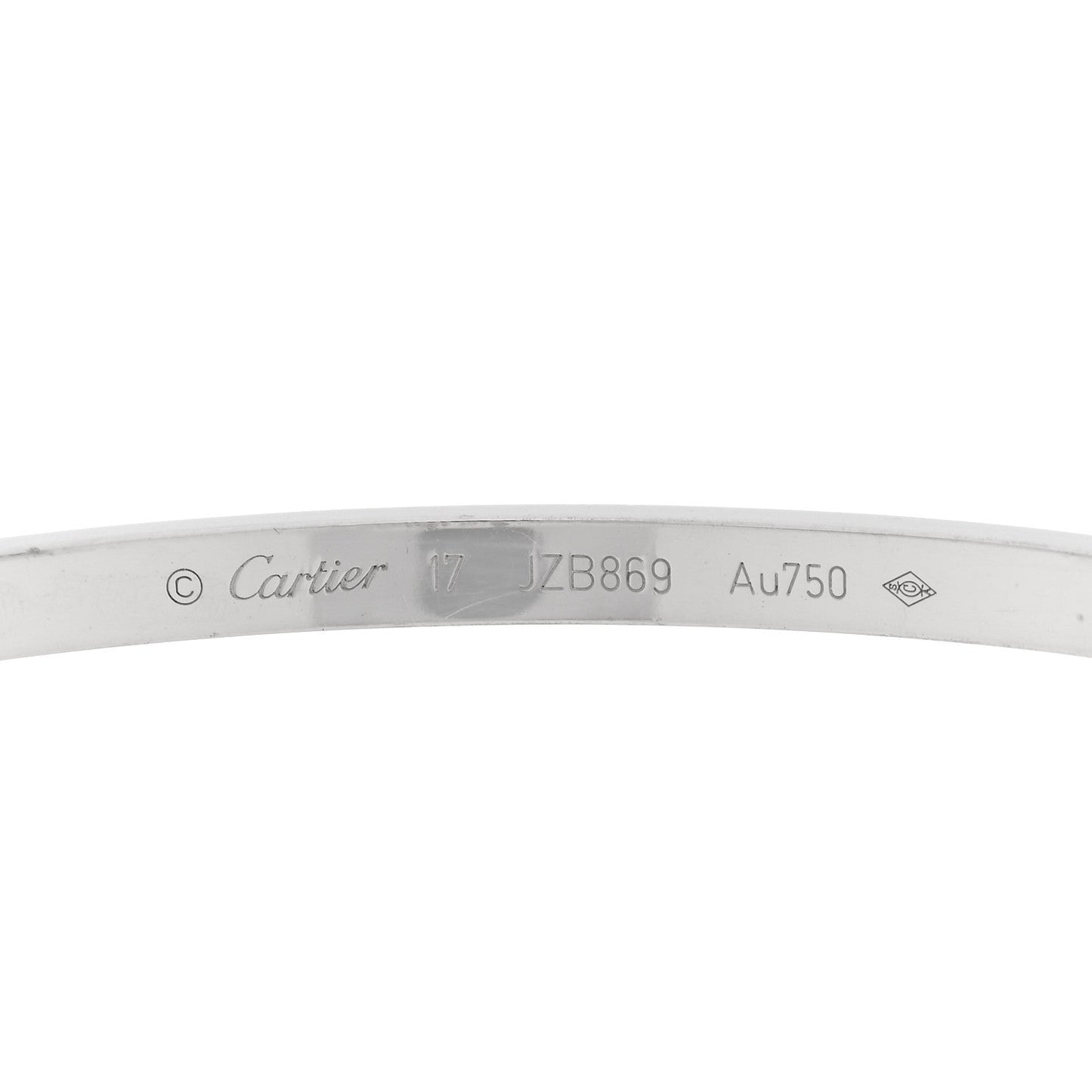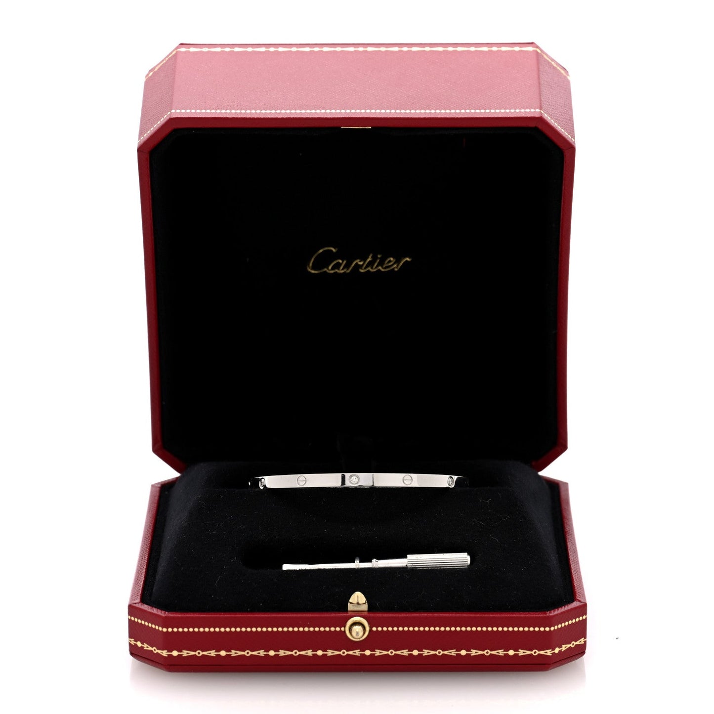 This is an authentic CARTIER 18K White Gold 6 Diamond Small LOVE Bracelet size 17. Part of Cartier's classic LOVE collection, this stunning 18 karat white gold bracelet opens at the hinge and features the engraved LOVE screw symbol alternating between six round brilliant cut diamonds weighing approximately .15 total carat weight.Follow this item for alerts. Cartier is a registered trademark of Cartier. FASHIONPHILE is not affiliated with Cartier.