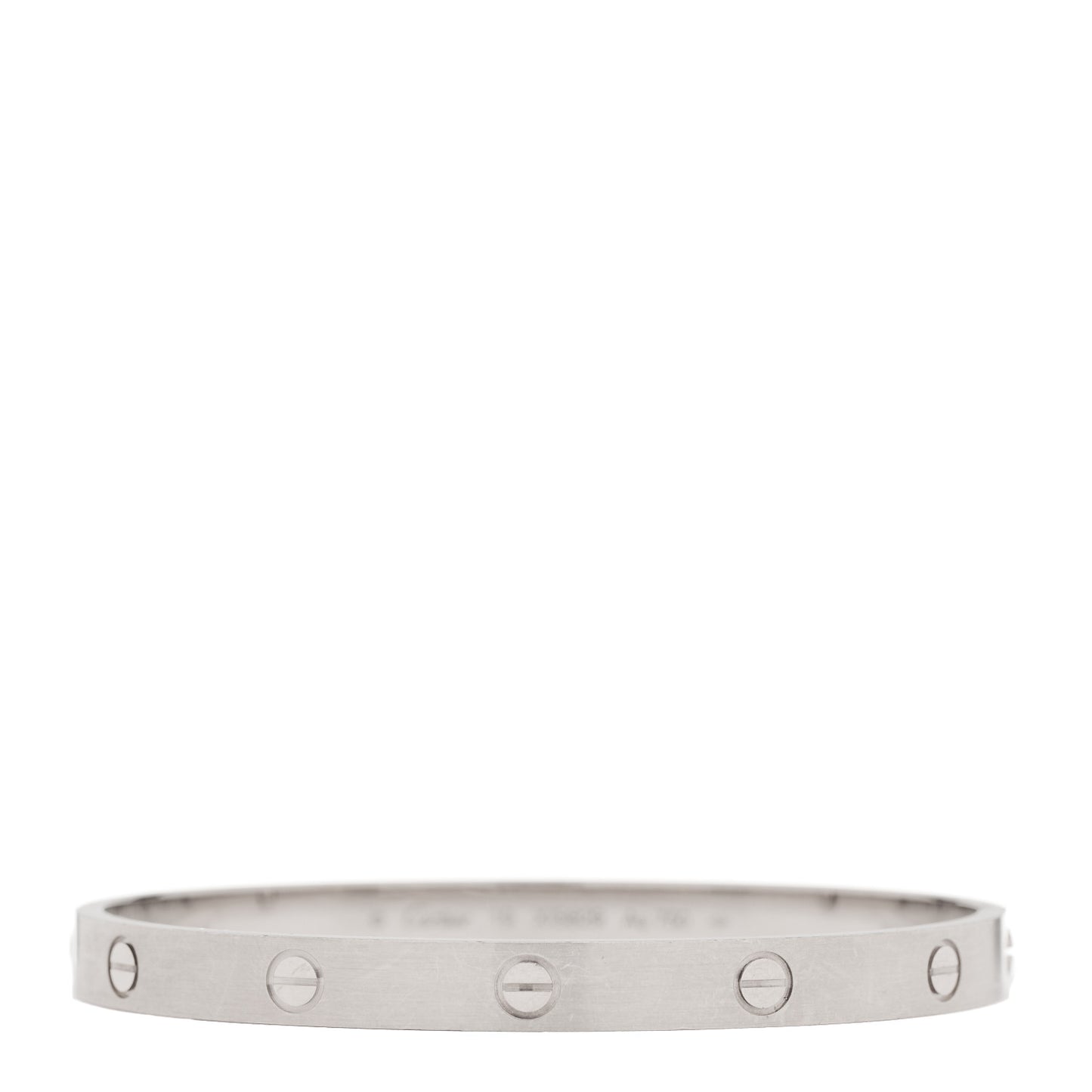 This is an authentic CARTIER 18K White Gold Brushed Finish LOVE Bracelet size 19. The bracelet is crafted of 18 karat white gold in a brushed finish and features the signature engraved LOVE screw motifs throughout the bangle. The bracelet also features two functional screws on either side to open and close.Follow this item for alerts. Cartier is a registered trademark of Cartier. FASHIONPHILE is not affiliated with Cartier.