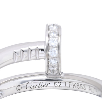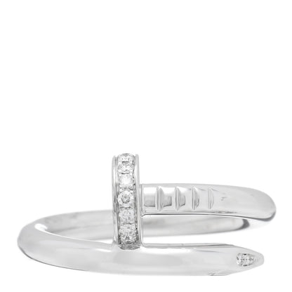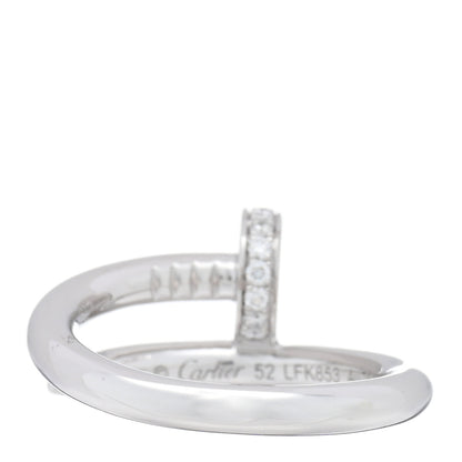 This is an authentic CARTIER 18K White Gold Diamond Juste Un Clou Ring size 52 or 6. The ring is crafted of 18 karat white gold and features a nail motif band pave-set with round brilliant cut diamonds, approximately .13 total carat weight.Follow this item for alerts. Cartier is a registered trademark of Cartier. FASHIONPHILE is not affiliated with Cartier.