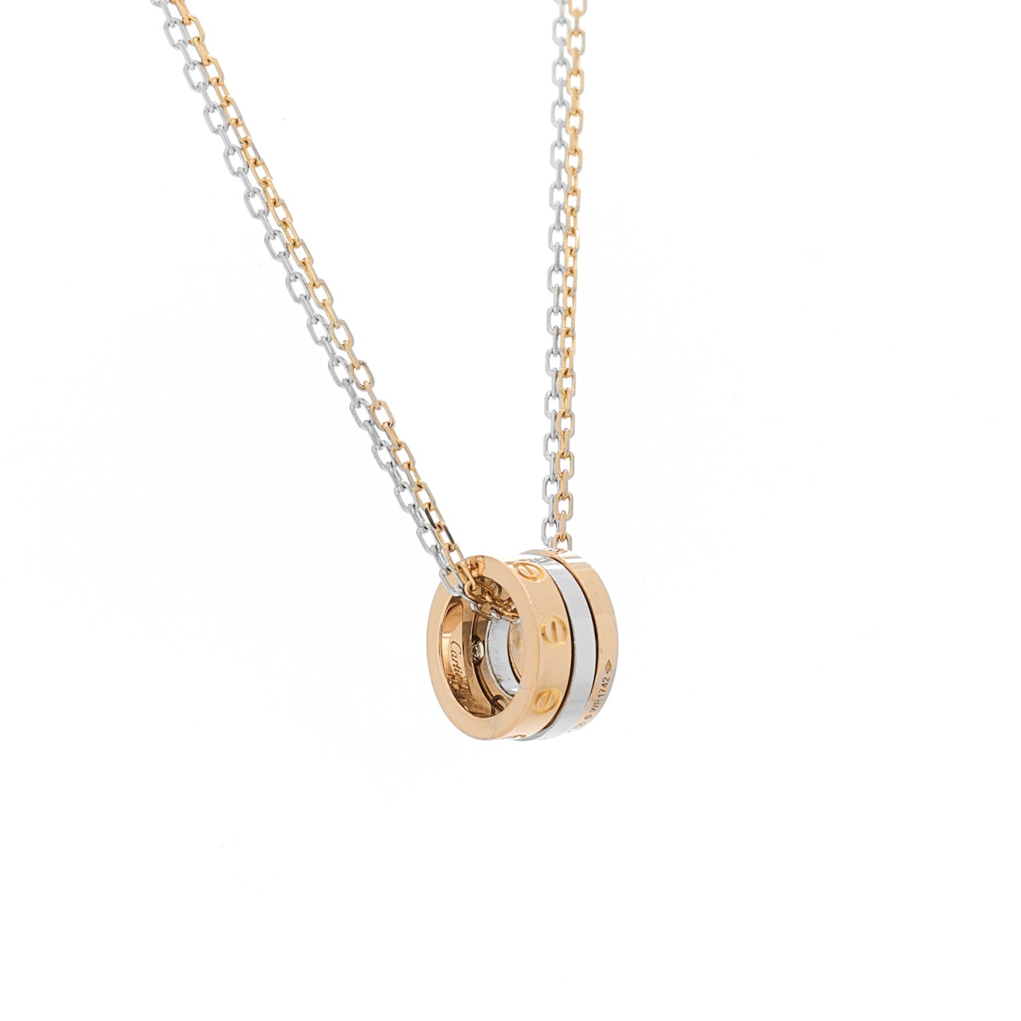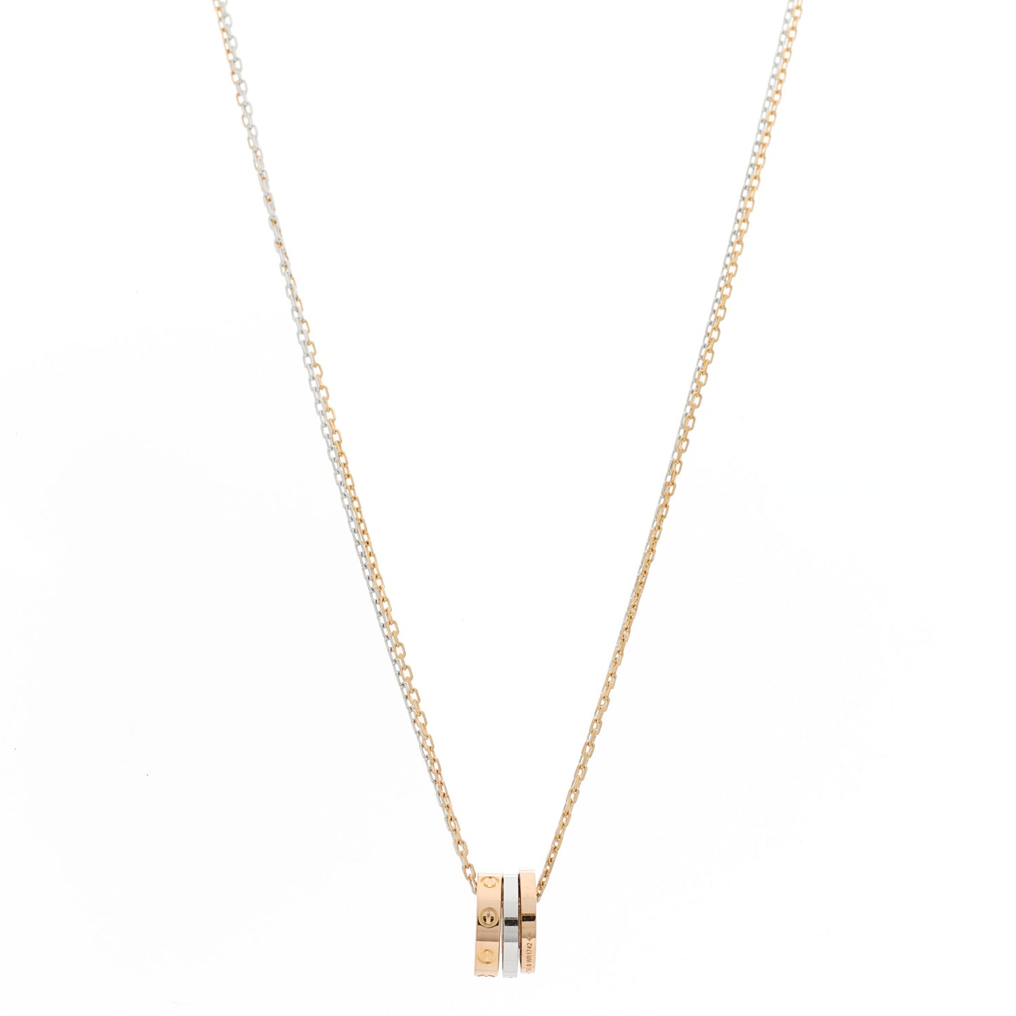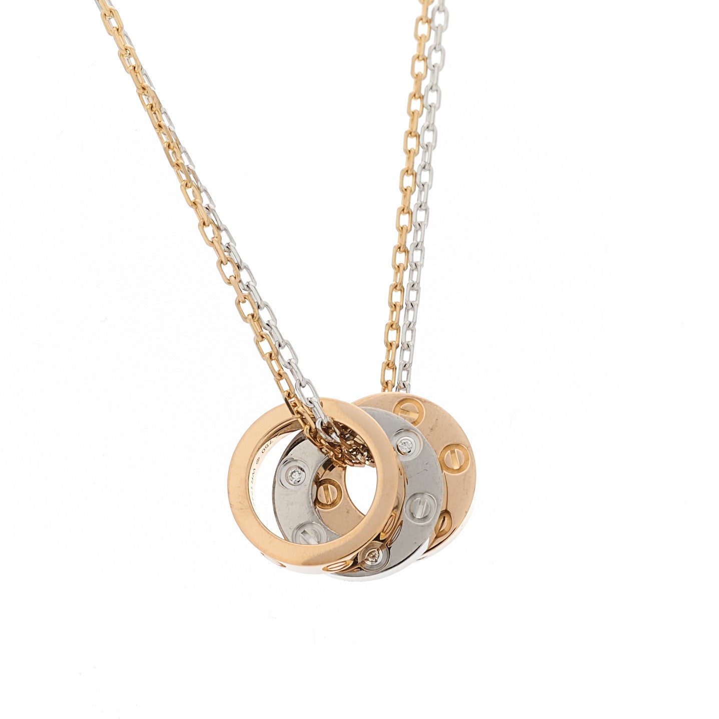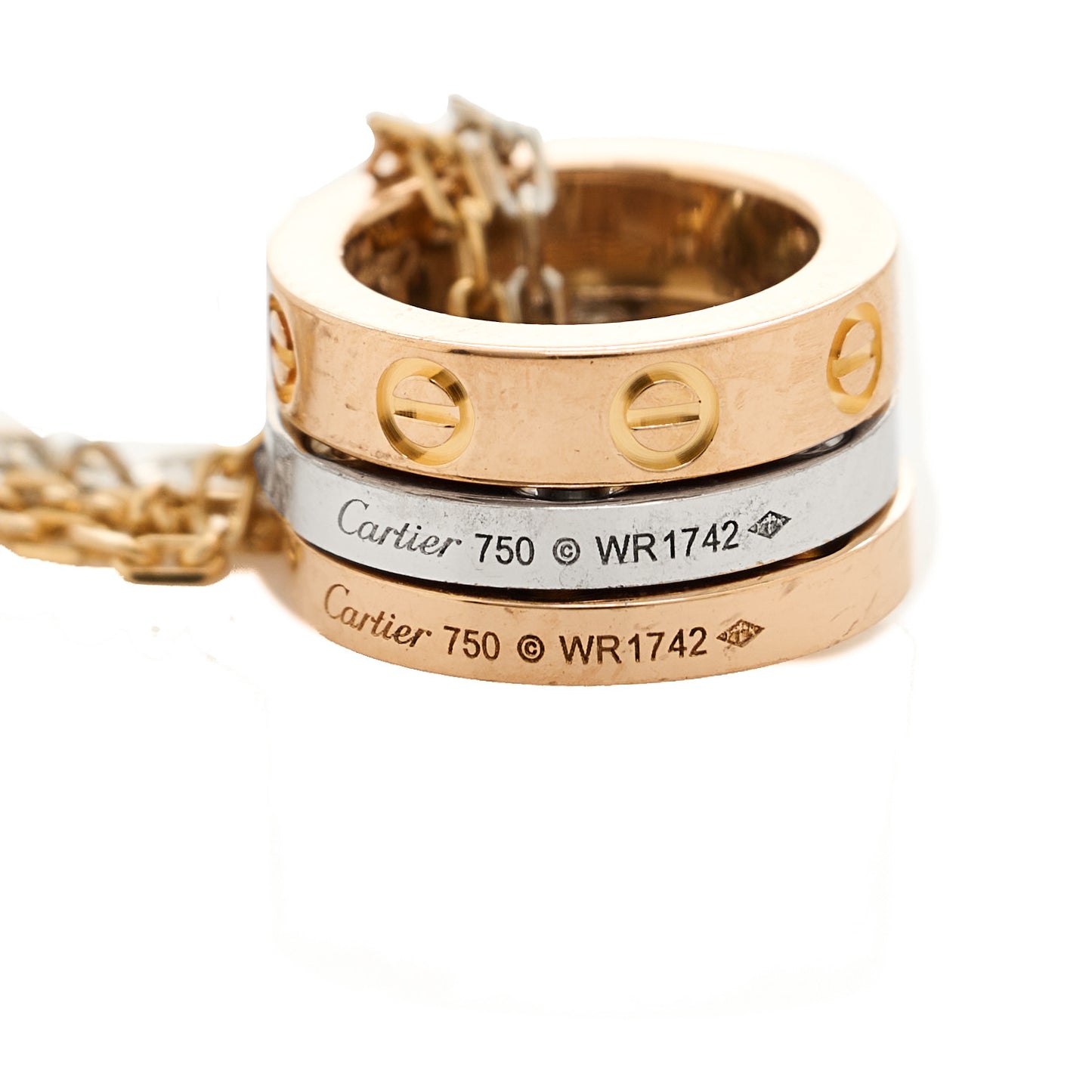 This is an authentic CARTIER 18K White Pink Gold Diamond Three Ring LOVE Pendant Necklace. The necklace is crafted of 18 karat white and pink gold, and features three LOVE ring pendants set with diamonds, approximately .01 total carat weight.Follow this item for alerts. Cartier is a registered trademark of Cartier. FASHIONPHILE is not affiliated with Cartier.