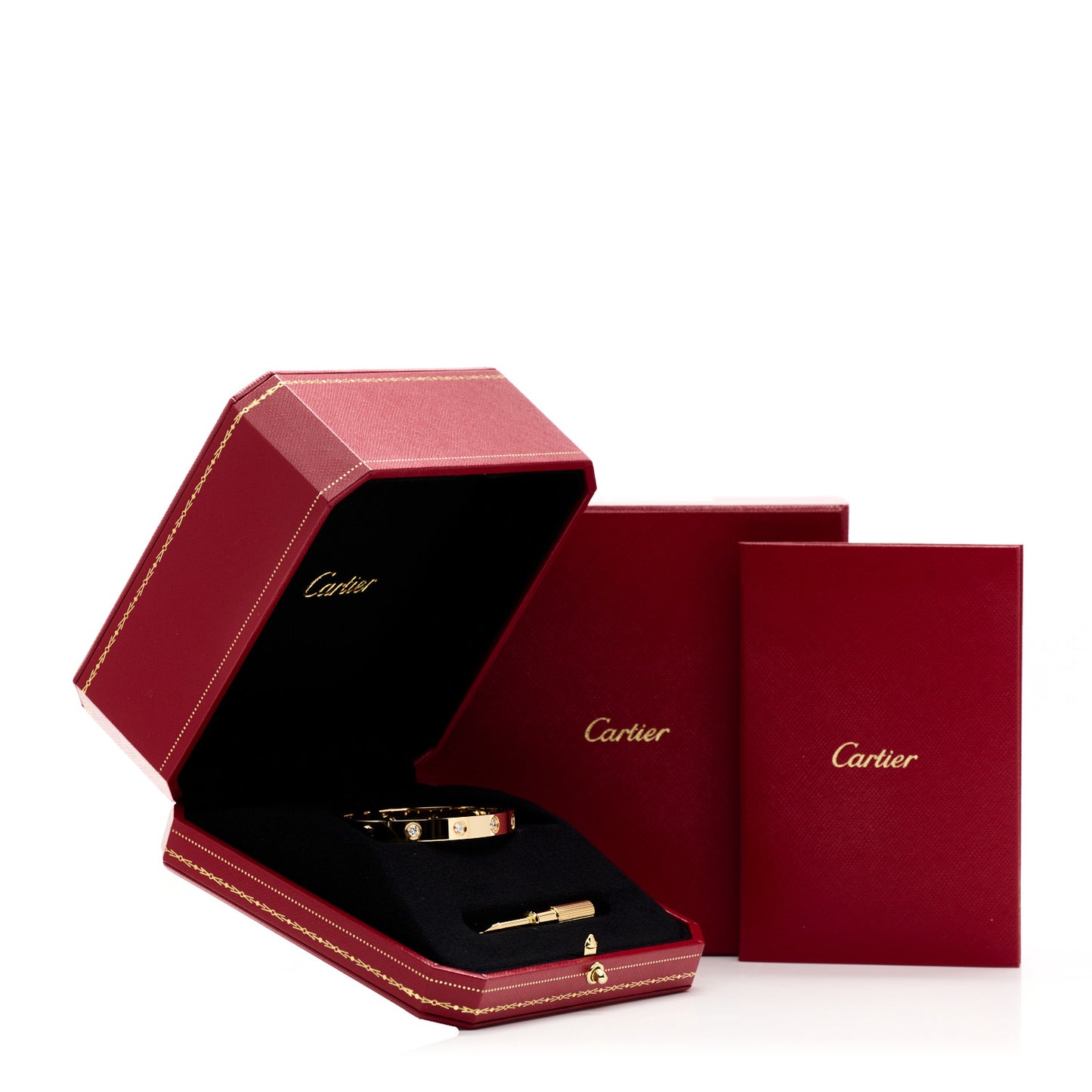 This is an authentic CARTIER 18K Yellow Gold 10 Diamond LOVE Bracelet size 16. This bracelet is crafted of 18 karat yellow gold and features ten bezel set round brilliant cut diamonds weighing approximately .96 total carat weight. The bracelet also features two functional screws on either side to open and close.Follow this item for alerts. Cartier is a registered trademark of Cartier. FASHIONPHILE is not affiliated with Cartier.