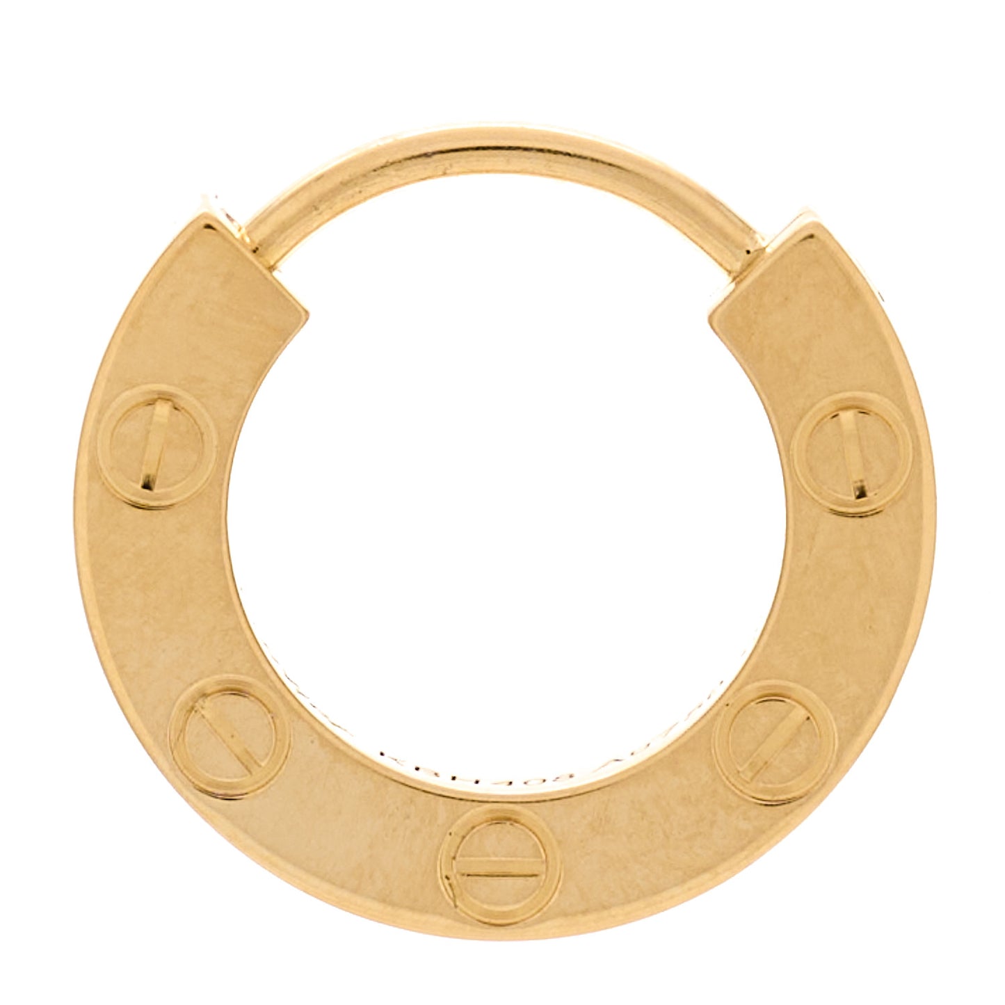 This is an authentic CARTIER 18K Yellow Gold Single LOVE Hoop Earring. The earring is crafted of 18 karat yellow gold and features the iconic Cartier screw symbols engraved throughout the hoop.Follow this item for alerts. Cartier is a registered trademark of Cartier. FASHIONPHILE is not affiliated with Cartier.