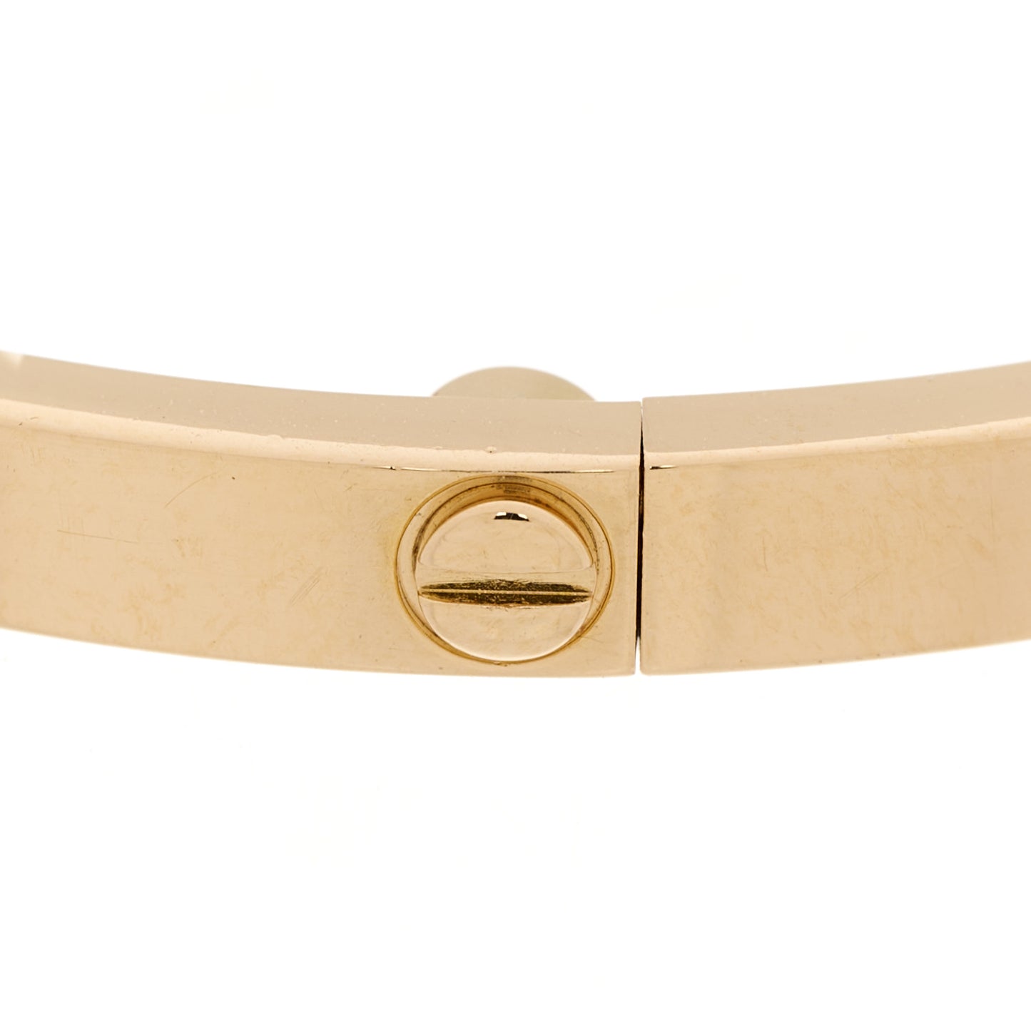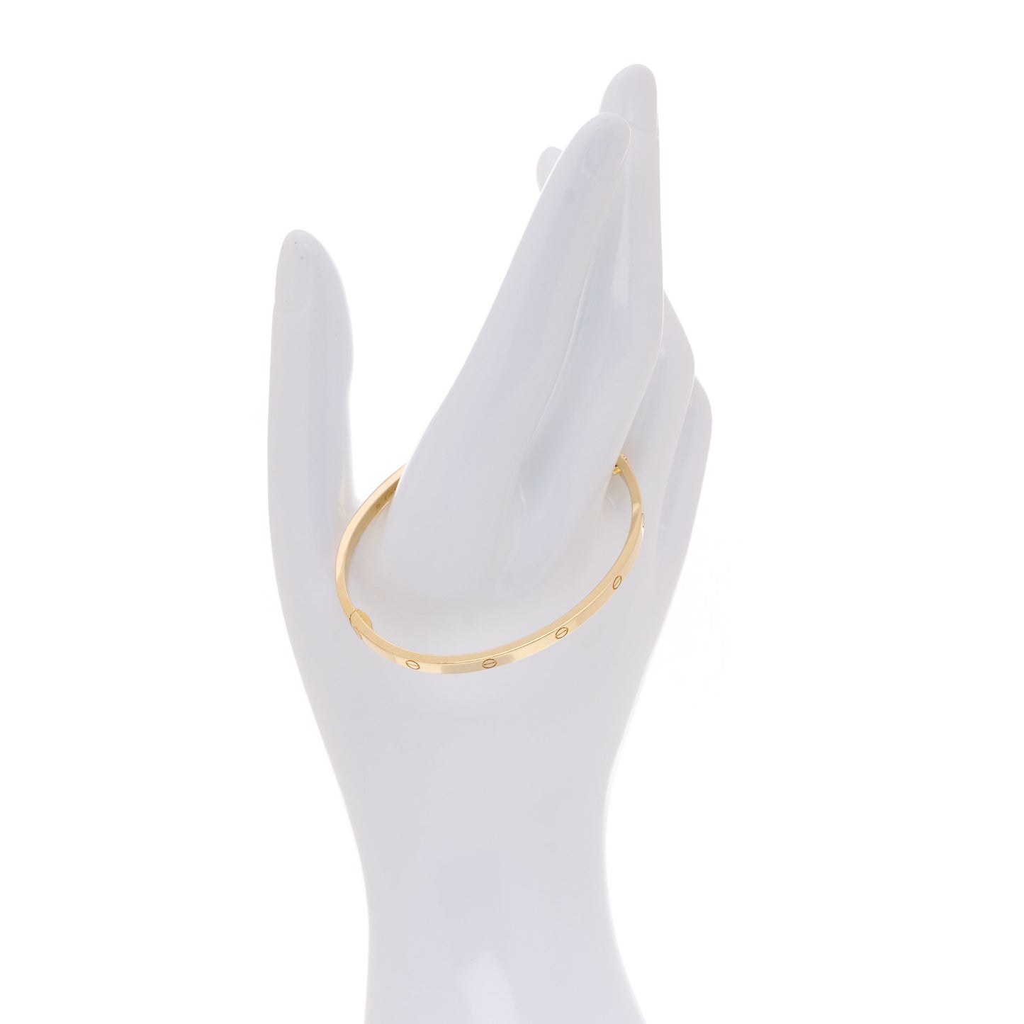 This is an authentic 18K Yellow Gold Small LOVE Bracelet size 17. The bracelet is crafted of 18 karat gold and features a hinged bangle accented with the signature LOVE screw motif engraved throughout the band.Follow this item for alerts. Cartier is a registered trademark of Cartier. FASHIONPHILE is not affiliated with Cartier.