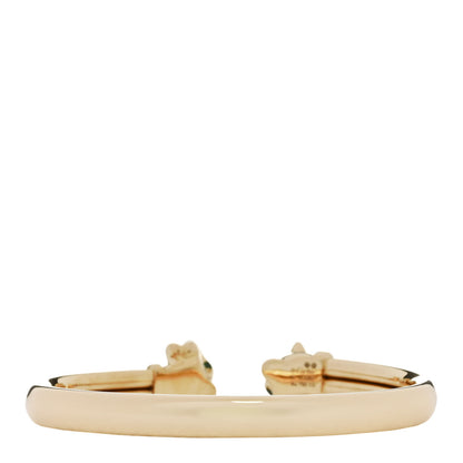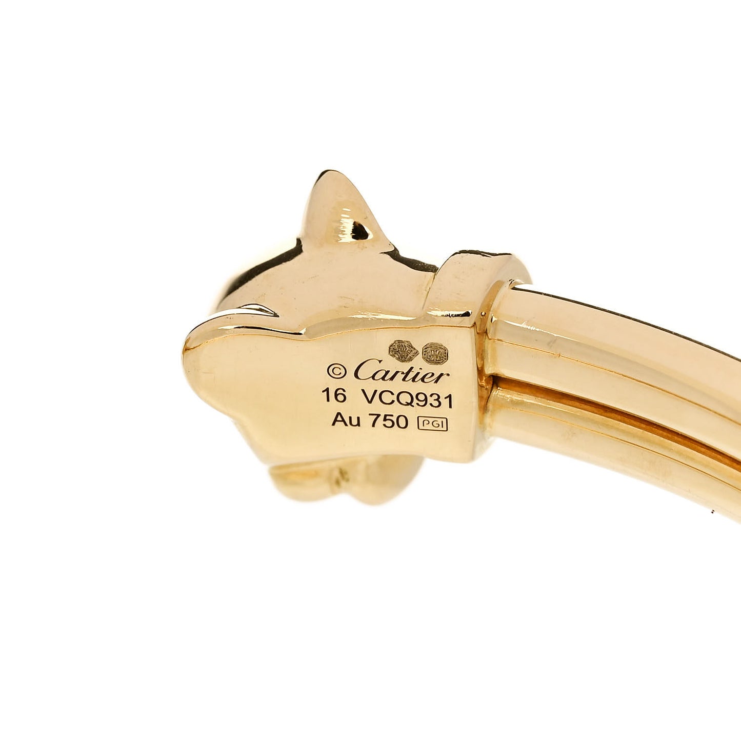 This is an authentic CARTIER 18K Yellow Gold Tsavorite Garnet Onyx Panthere De Cartier Cuff Bracelet size 16. The bracelet is crafted of 18 karat yellow gold and features an open cuff design with two panther head motifs set with tsavorite garnets and black onyx.Follow this item for alerts. Cartier is a registered trademark of Cartier. FASHIONPHILE is not affiliated with Cartier.