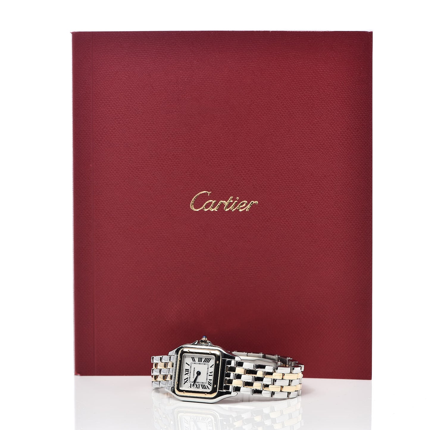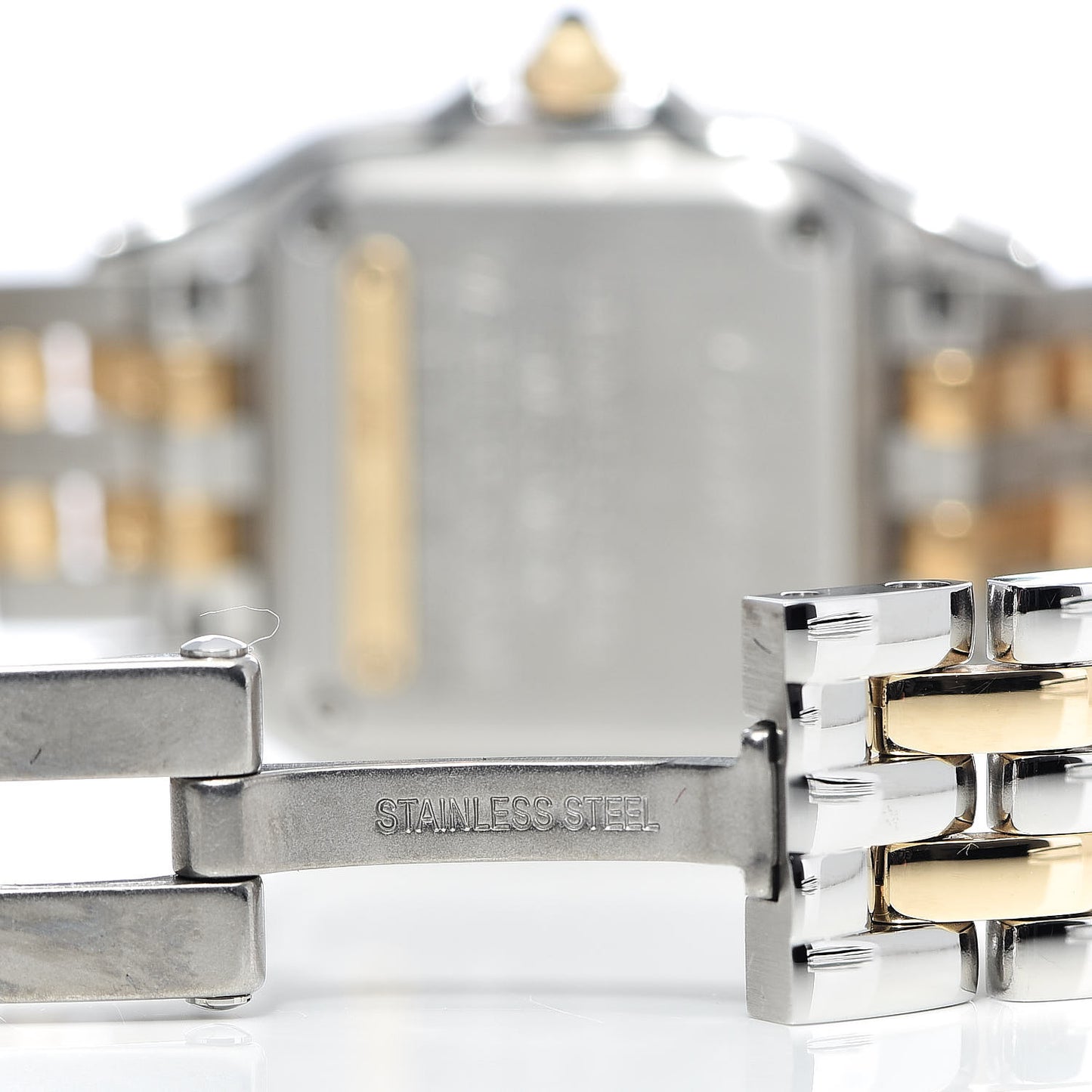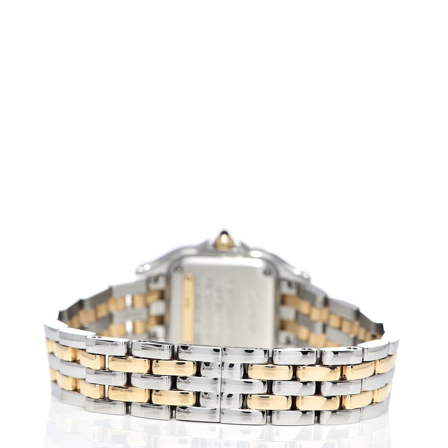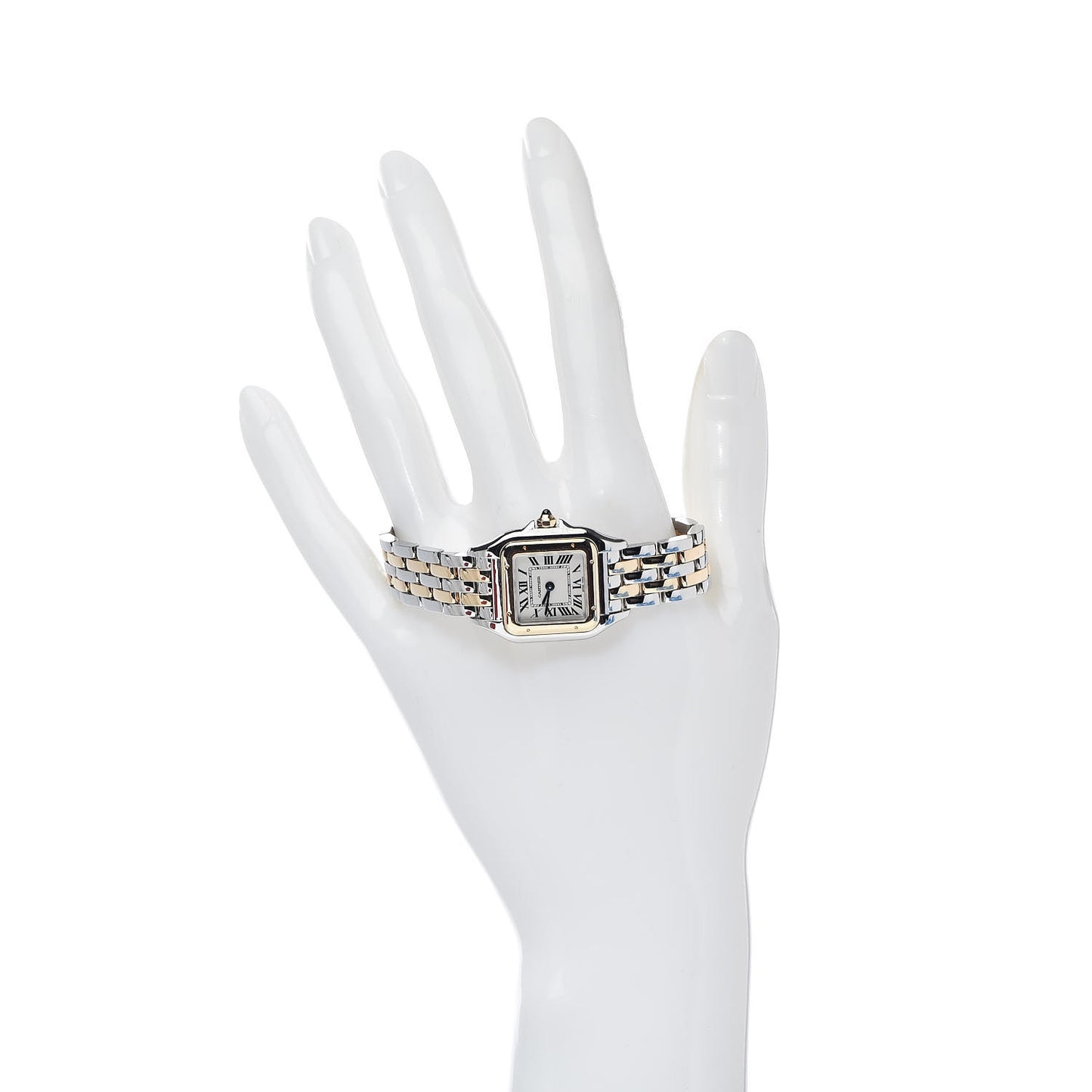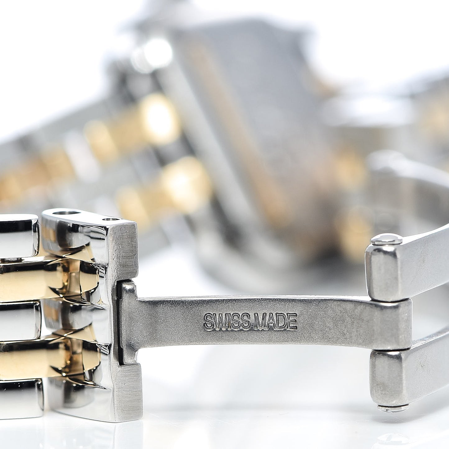 This is an authentic CARTIER Stainless Steel 18K Yellow Gold 22mm Small Panthere Quartz Watch. The watch is crafted of stainless steel and 18 karat yellow gold and features Roman numeral hour markers, sapphire crystal, two-tone link bracelet, and a quartz movement. This is a beautiful watch the elegant style of Cartier!Follow this item for alerts. Cartier is a registered trademark of Cartier. FASHIONPHILE is not affiliated with Cartier.