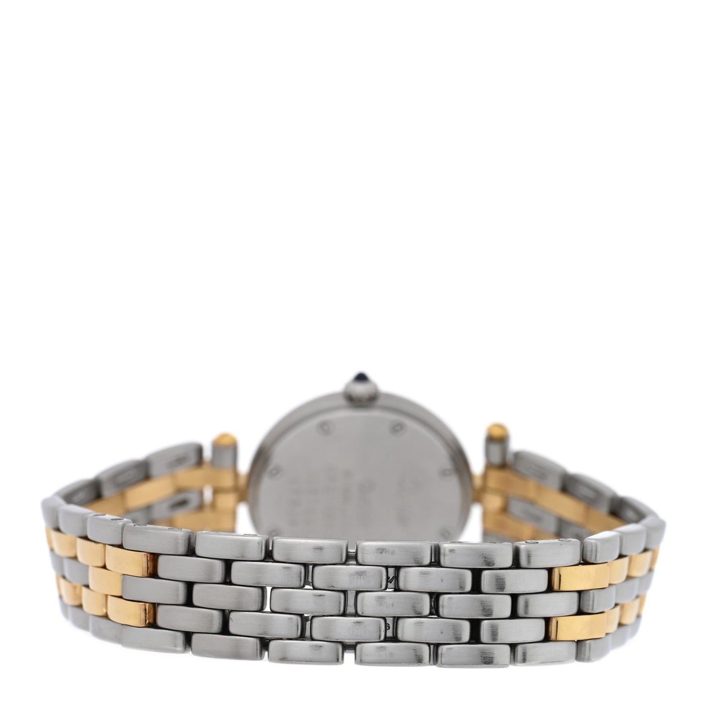 This is an authentic CARTIER Stainless Steel 18K Yellow Gold 24mm Panthere Vendome Quartz Watch. The watch is crafted of stainless steel and 18 karat yellow gold, and features an ivory dial with Roman numeral hour markers, blue steel sword hands, sapphire crystal, blue spinel cabochon crown, two-tone link bracelet, double deployant clasp, and a quartz movement.Follow this item for alerts. Cartier is a registered trademark of Cartier. FASHIONPHILE is not affiliated with Cartier.