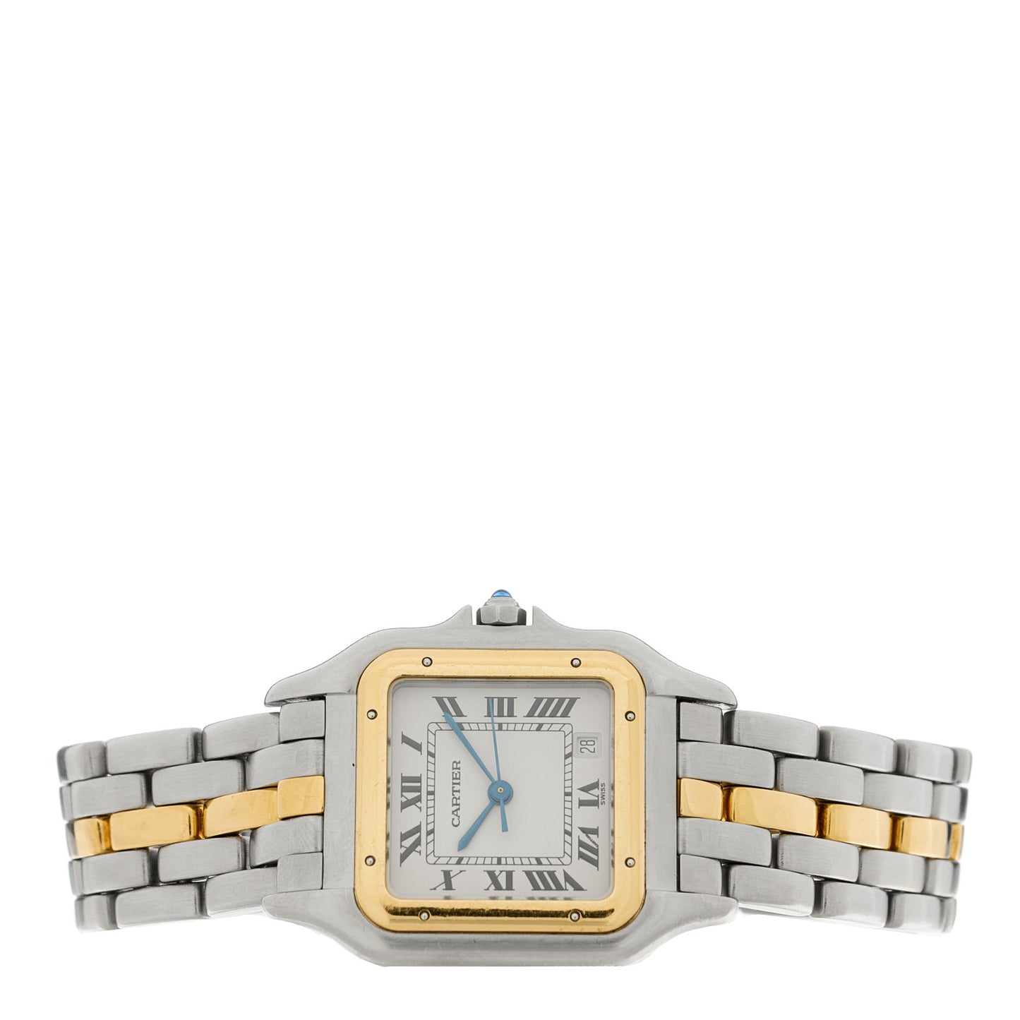 This is an authentic CARTIER Stainless Steel 18K Yellow Gold 27mm Panthere Quartz Watch. The watch is crafted of stainless steel and 18 karat yellow gold, and features an ivory dial with black Roman numeral hour markers, blue steel sword hands, date indicator, sapphire crystal, blue cabochon crown, two-tone link bracelet with hidden deployant clasp, and a quartz movement.Follow this item for alerts. Cartier is a registered trademark of Cartier. FASHIONPHILE is not affiliated with Cartier.