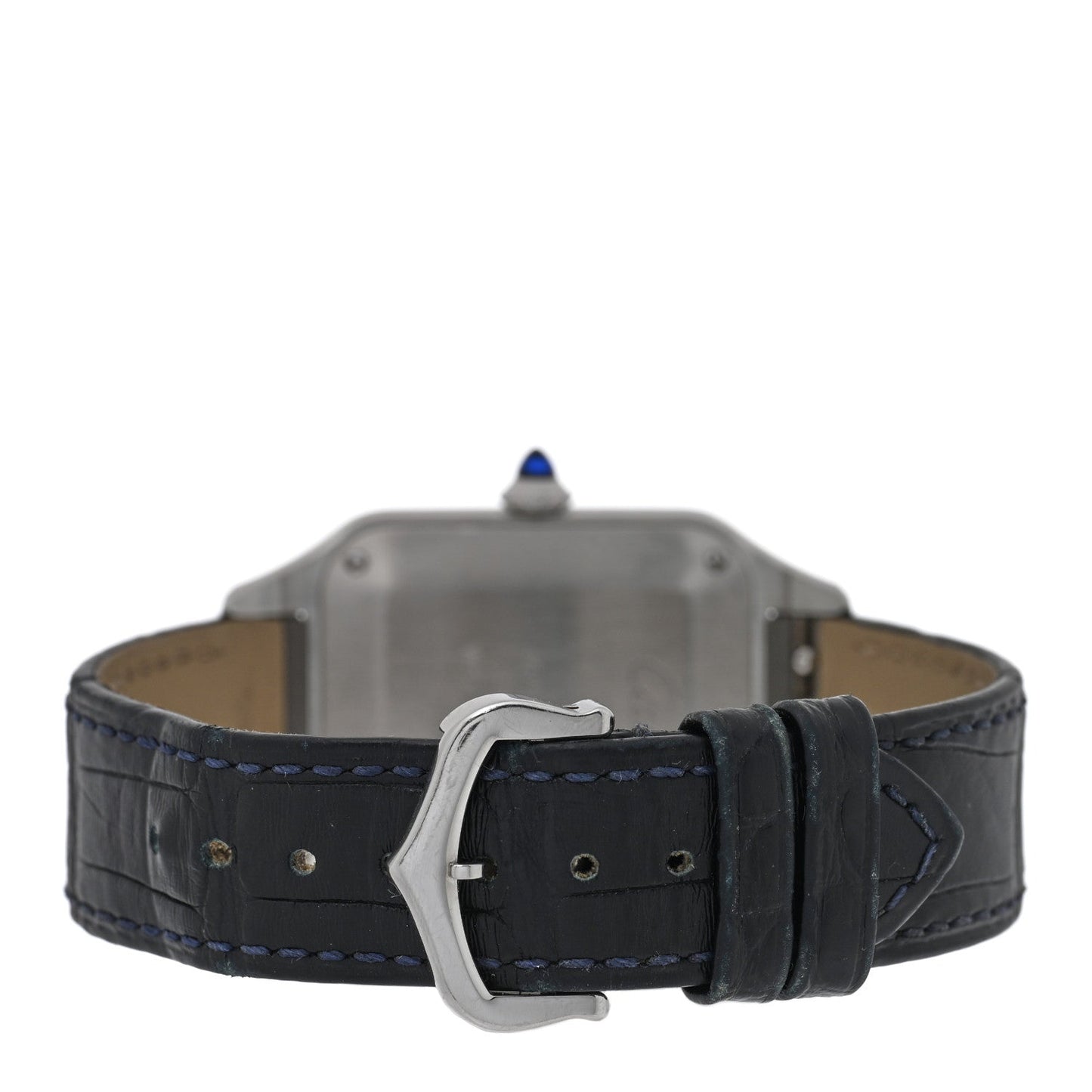 This is an authentic CARTIER Stainless Steel Alligator 31.4mm Santos Dumont Quartz Watch Blue. The watch is crafted of stainless steel and features a silver dial with Roman numeral hour markers, sapphire crystal, blue spinel crown, blue alligator strap, and a quartz movement.Follow this item for alerts. Cartier is a registered trademark of Cartier. FASHIONPHILE is not affiliated with Cartier.