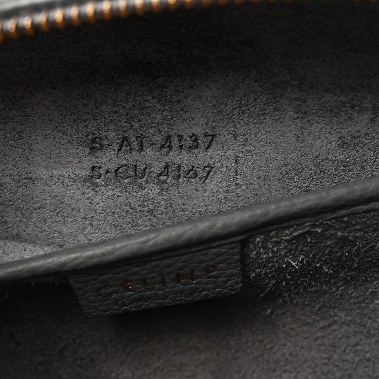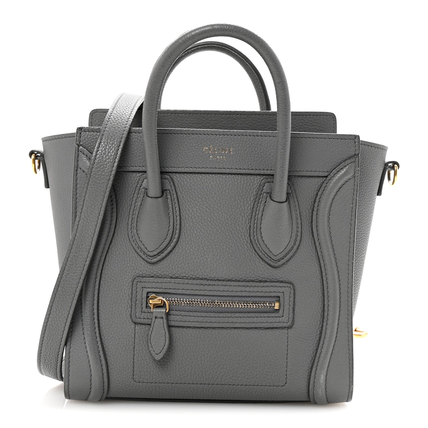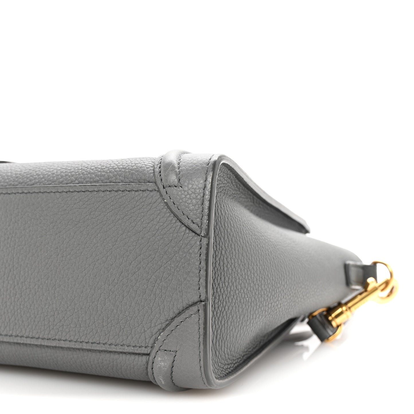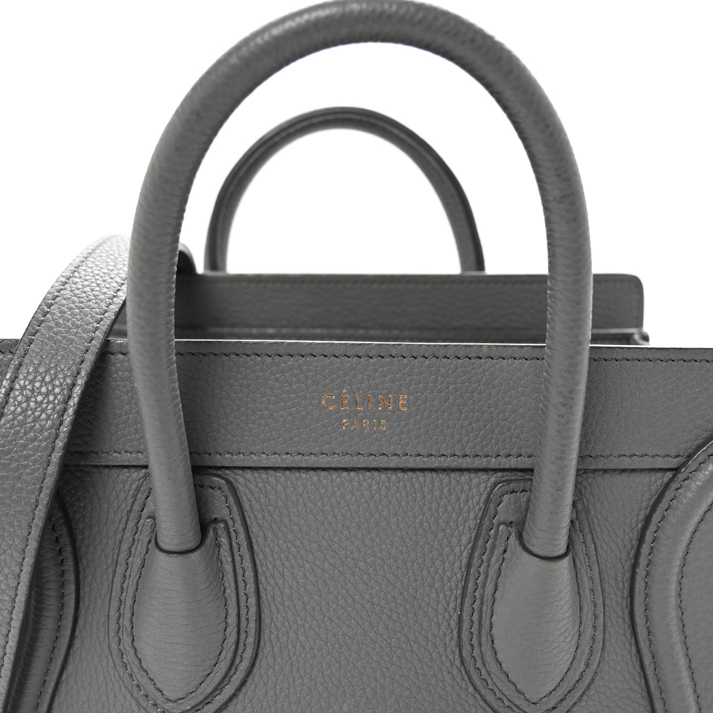 This is an authentic CELINE Baby Drummed Calfskin Nano Luggage in Kohl. This stylish small tote is crafted of soft, heavily grained calfskin leather in grey. This bag features rolled leather top handles an optional shoulder strap with aged gold clasps, decorative leather detailing, and an exterior zipper pocket. The top unzips to a matching suede interior with a patch pocket.Follow this item for alerts. Celine is a registered trademark of Celine. FASHIONPHILE is not affiliated with Celine.