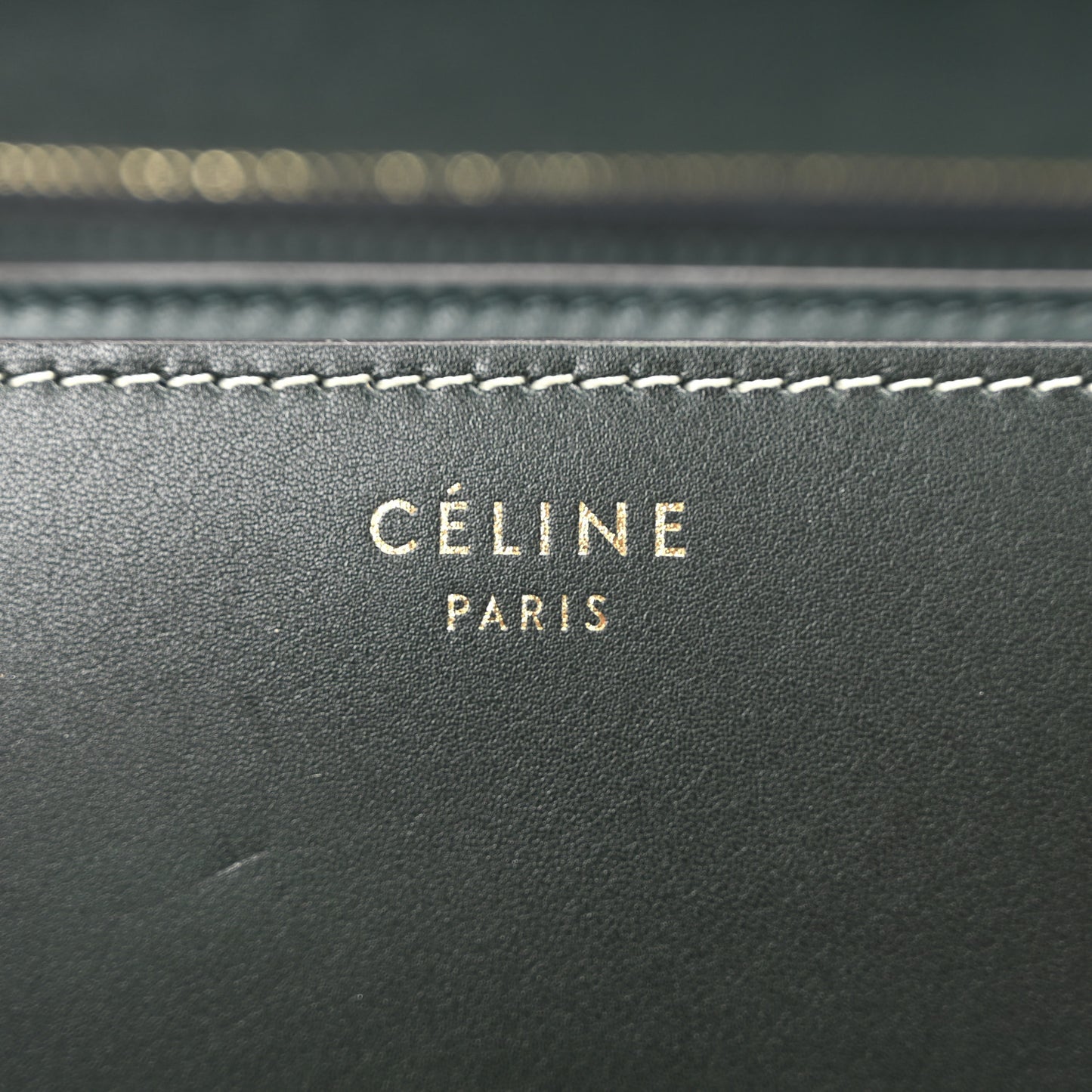 This is an authentic CELINE Box Calfskin Medium Classic Box Flap Bag in Amazone. This chic shoulder bag is crafted of smooth calfskin leather in dark green. It features an adjustable leather shoulder strap and a gold press lock on the front. This opens the flap to a partitioned green leather interior with a zipper compartment and patch pockets.Follow this item for alerts. Celine is a registered trademark of Celine. FASHIONPHILE is not affiliated with Celine.