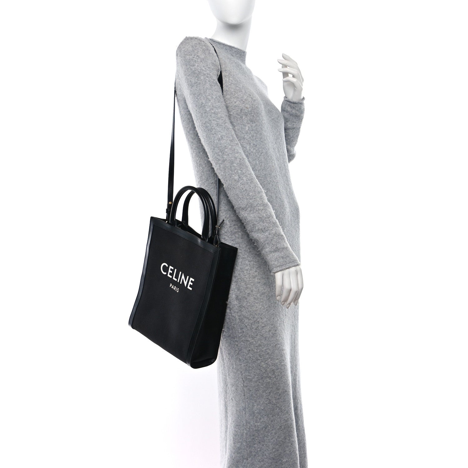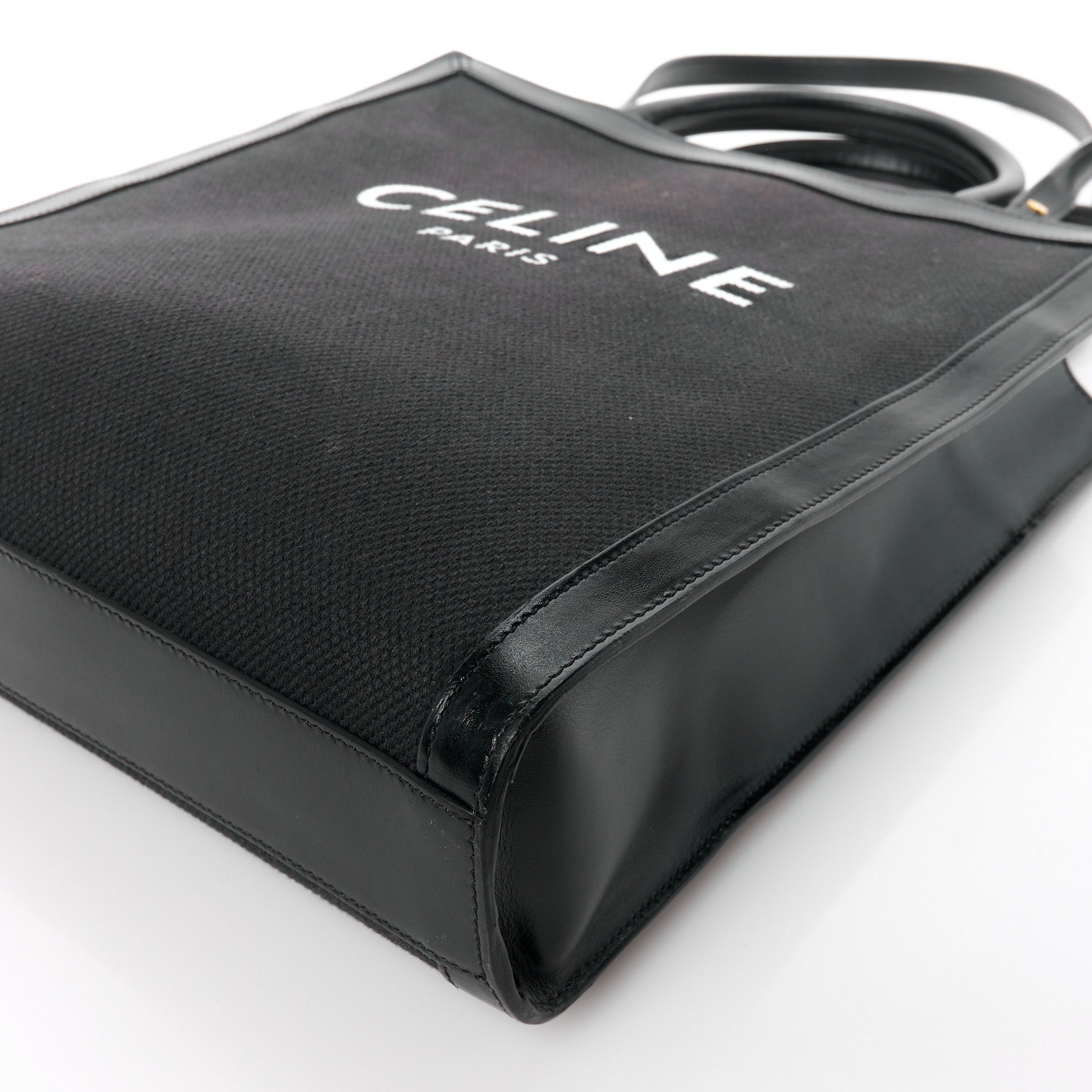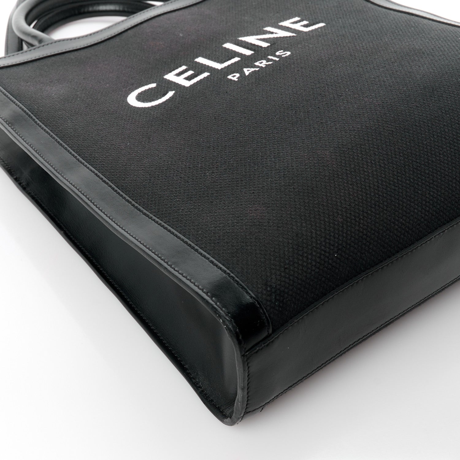 This is an authentic CELINE Canvas Calfskin Small Vertical Cabas in Black. This tote is crafted of black canvas with black leather trim. The bag features black leather top handles, an optional shoulder strap, and a white Celine logo on the front. The top is open to a canvas interior with a zipper pocket.Follow this item for alerts. Celine is a registered trademark of Celine. FASHIONPHILE is not affiliated with Celine.