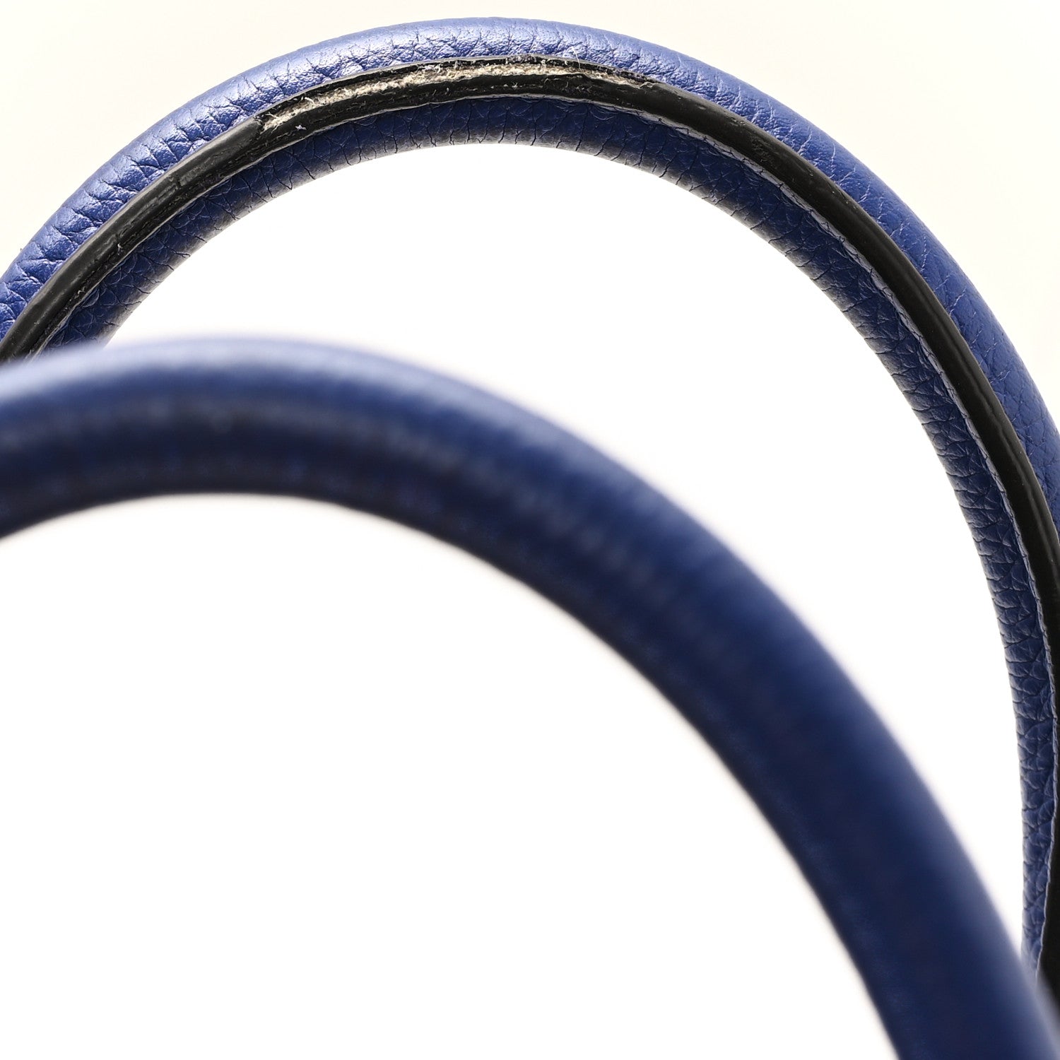 This is an authentic CELINE Drummed Calfskin Micro Luggage in Indigo. This stylish tote is crafted of grained calfskin leather in rich blue. The bag features rolled leather top handles, decorative leather scroll detailing, and an exterior zipper pocket. The top zipper opens to a matching blue microfiber interior with zipper and patch pockets.Follow this item for alerts. Celine is a registered trademark of Celine. FASHIONPHILE is not affiliated with Celine.