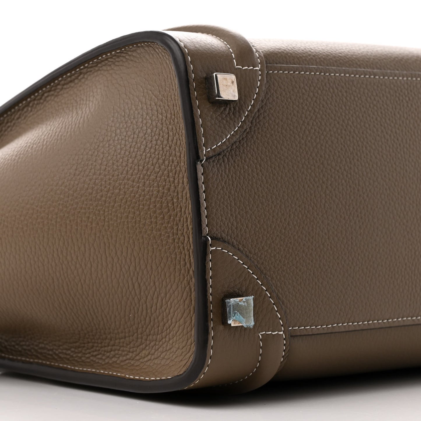 This is an authentic CELINE Drummed Calfskin Micro Luggage in Souris. This sophisticated travel tote is crafted of luxuriously textured leather in dark beige. The bag features rolled leather top handles, expandable sides, a frontal zipper pocket, and decorative leather trim. The top zipper opens to a matching microfiber interior with zipper and patch pockets.Follow this item for alerts. Celine is a registered trademark of Celine. FASHIONPHILE is not affiliated with Celine.
