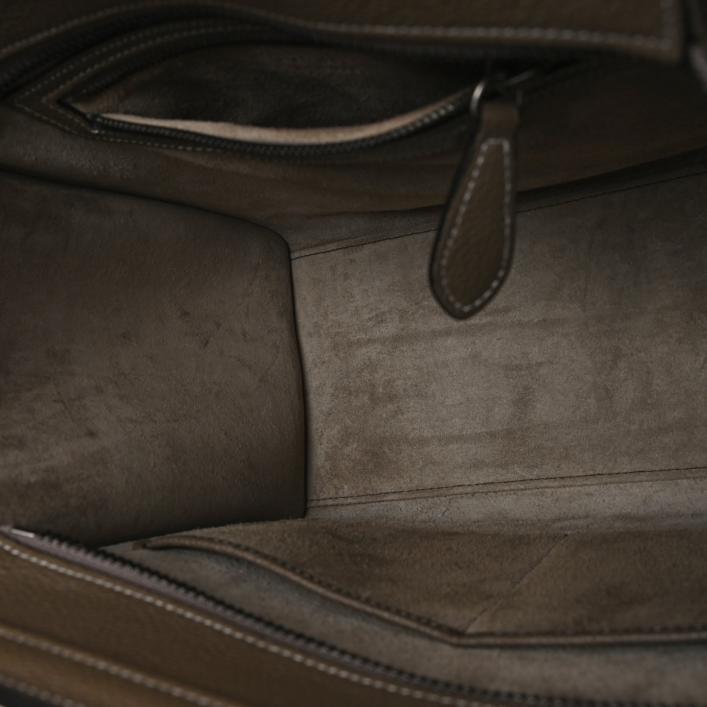 This is an authentic CELINE Drummed Calfskin Micro Luggage in Souris. This sophisticated travel tote is crafted of luxuriously textured leather in dark beige. The bag features rolled leather top handles, expandable sides, a frontal zipper pocket, and decorative leather trim. The top zipper opens to a matching microfiber interior with zipper and patch pockets.Follow this item for alerts. Celine is a registered trademark of Celine. FASHIONPHILE is not affiliated with Celine.