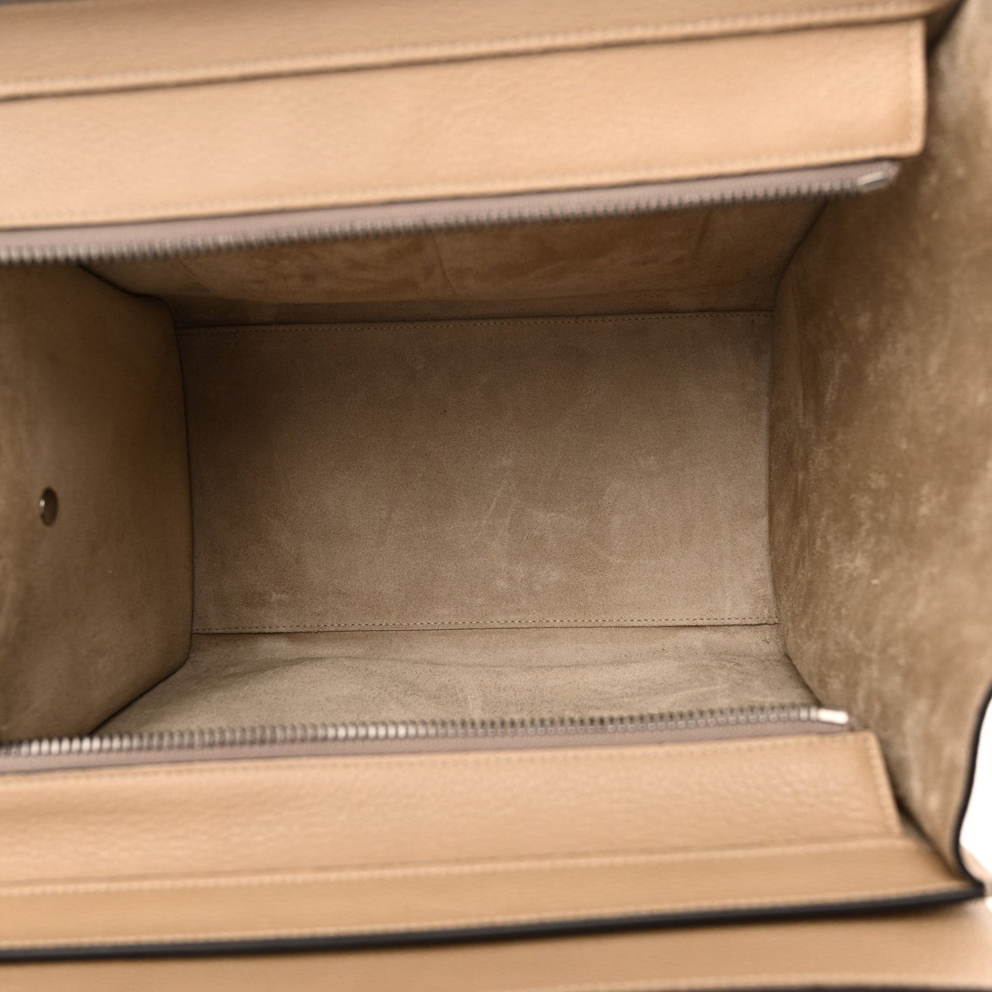 This is an authentic CELINE Drummed Calfskin Mini Luggage in Dune. This stylish tote is crafted of grained calfskin leather in beige. It features rolled leather top handles, silver hardware, decorative leather detailing, and an exterior zipper pocket. The top unzips to a beige suede interior with zipper and patch pockets.Follow this item for alerts. Celine is a registered trademark of Celine. FASHIONPHILE is not affiliated with Celine.