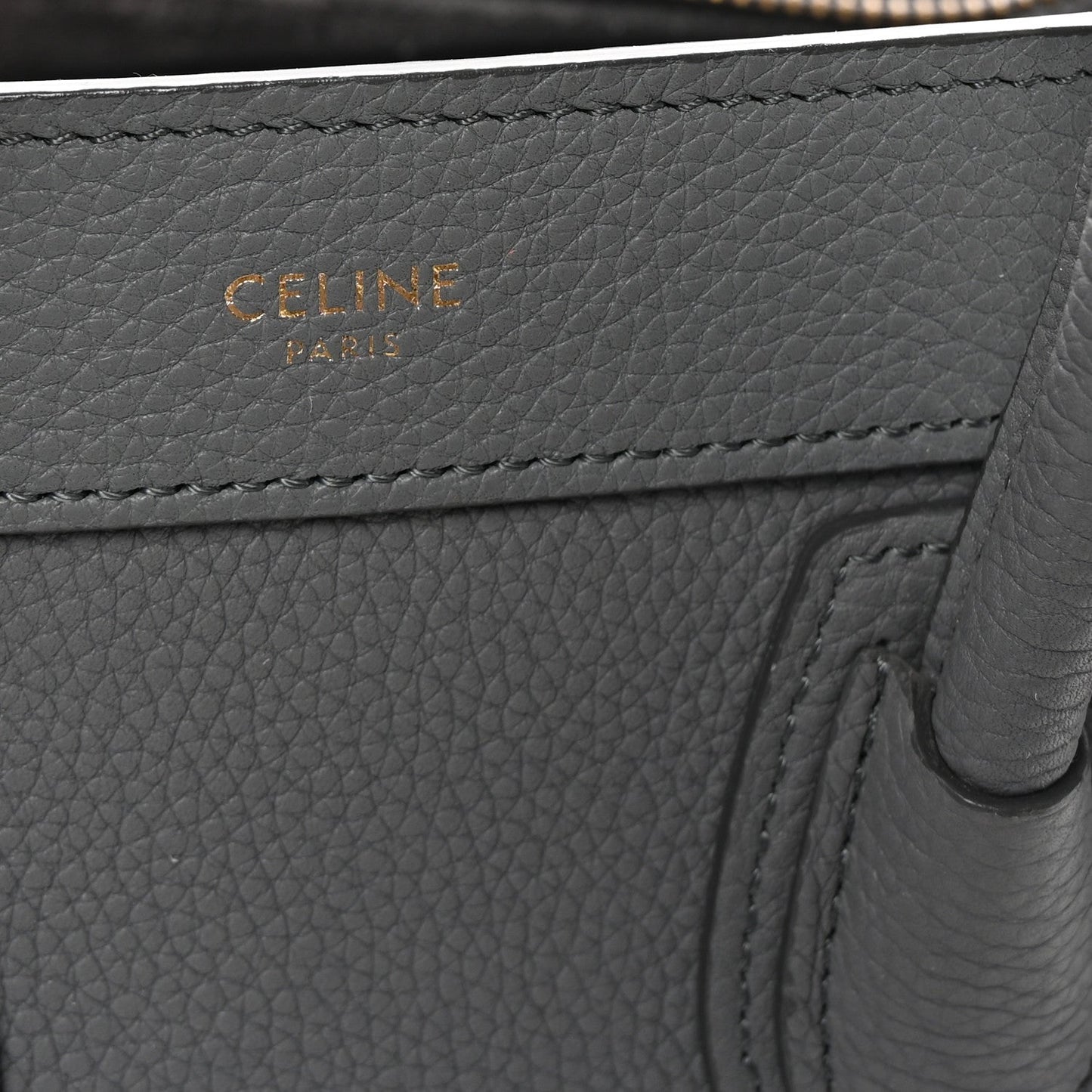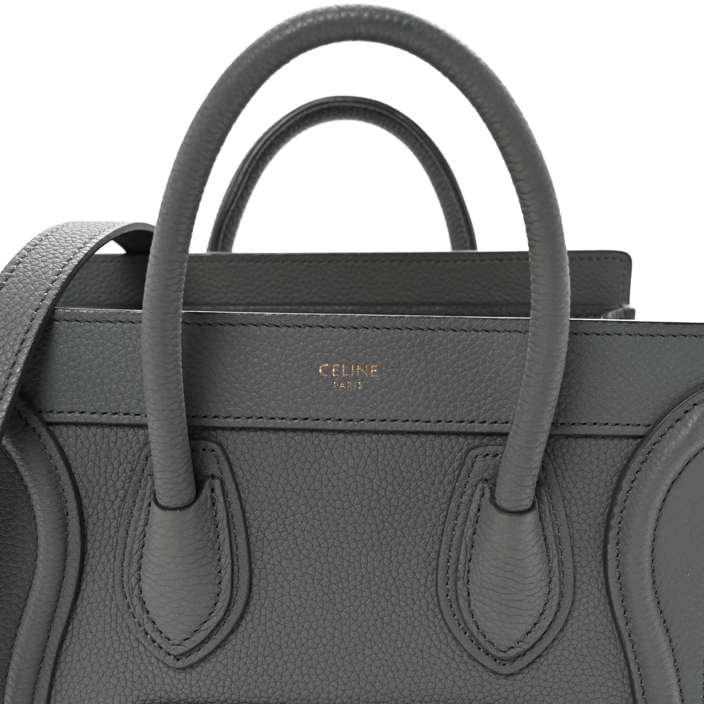 This is an authentic CELINE Drummed Calfskin Nano Luggage in Kohl. This stylish small tote is crafted of soft, heavily-grained calfskin leather in gray. This bag features rolled leather top handles an optional shoulder strap with aged gold clasps, decorative leather detailing, and a front zipper pocket. The top zipper opens to a matching gray suede interior with a patch pocket.Follow this item for alerts. Celine is a registered trademark of Celine. FASHIONPHILE is not affiliated with Celine.