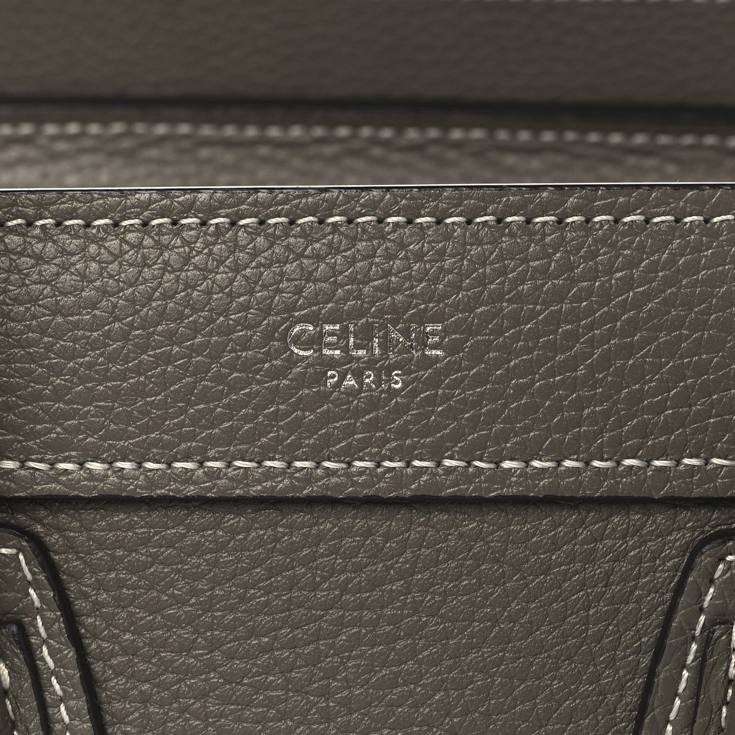 This is an authentic CELINE Drummed Calfskin Nano Luggage in Souris. This stylish small tote is crafted of soft, heavily grained calfskin leather in a grey with contrast white stitching. This bag features rolled leather top handles, an optional shoulder strap with aged silver clasps, decorative leather detailing, and an exterior zipper pocket. The top unzips to a matching suede interior with a patch pocket.Follow this item for alerts. Celine is a registered trademark of Celine. FASHIONPHILE is not affiliated with Celine.