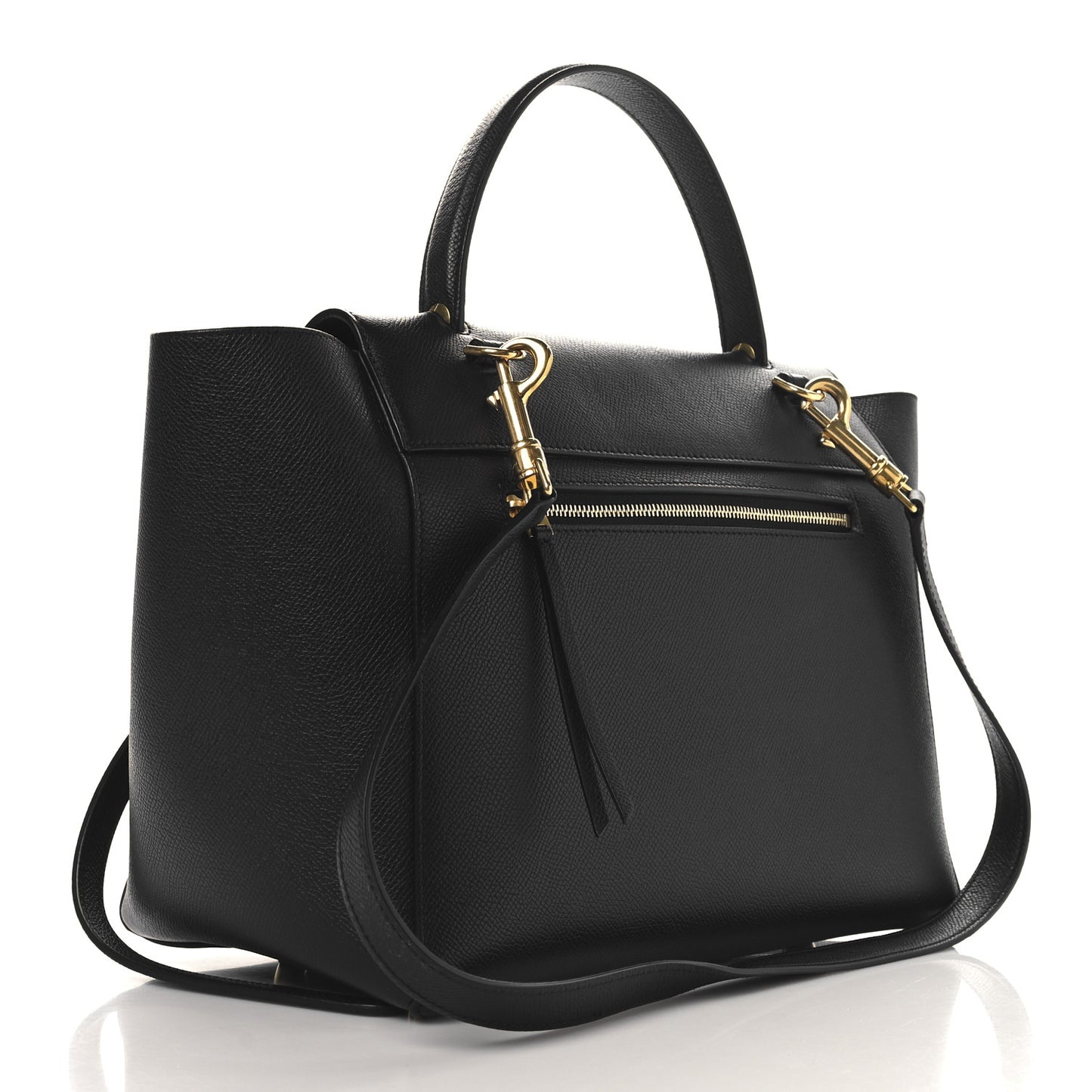 This is an authentic CELINE Grained Calfskin Mini Belt Bag in Black. This chic tote is crafted of grained calfskin leather in black with a structured and spacious silhouette. The bag features a leather strap top handle, optional shoulder strap with gold hardware, and a front-facing flap that is secured by decorative knotted straps. The facing flap opens to a suede interior with leather patch pockets.Follow this item for alerts. Celine is a registered trademark of Celine. FASHIONPHILE is not affiliated with Celine.