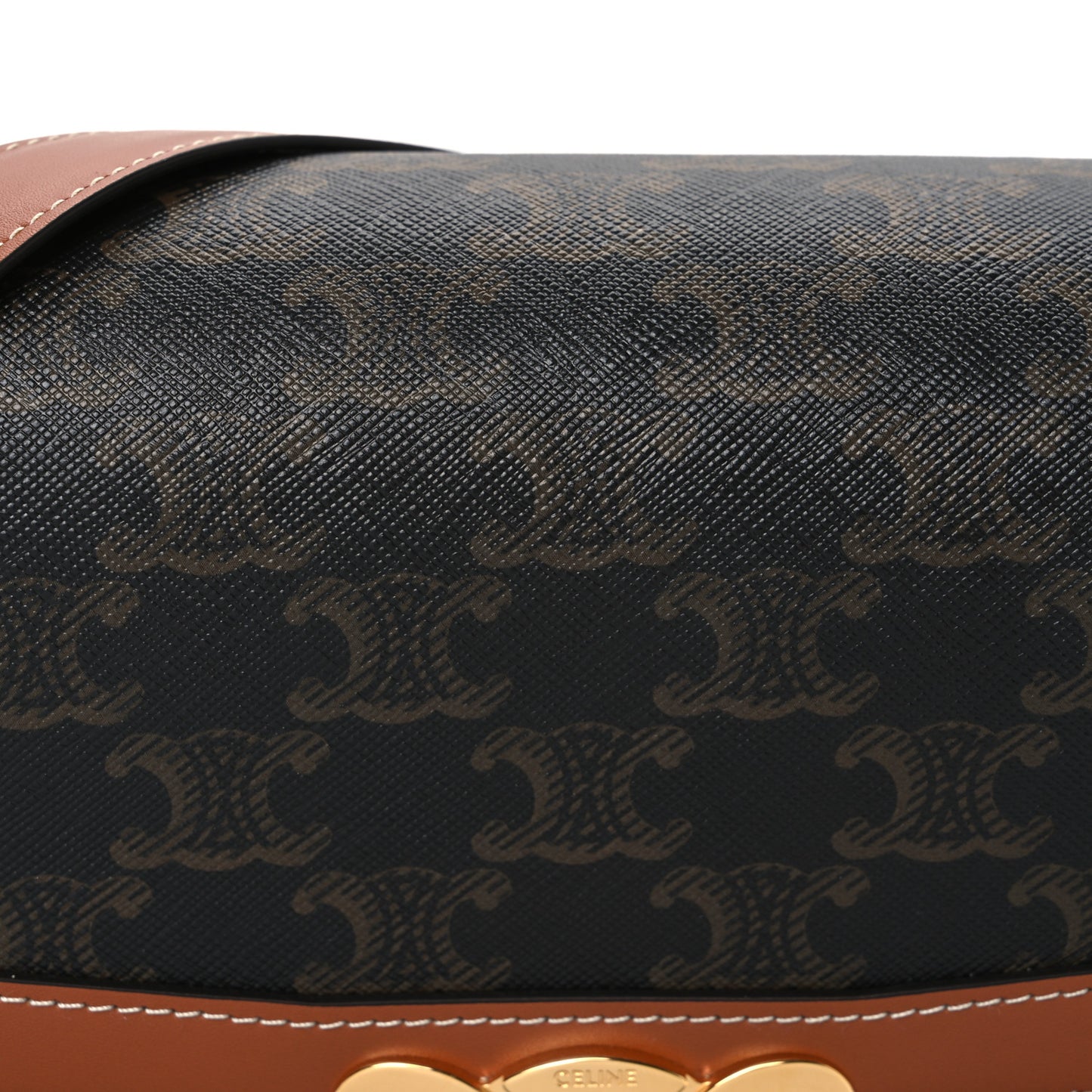 This is an authentic CELINE Triomphe Canvas Calfskin Medium Triomphe Bag in Tan. This chic shoulder bag is crafted of black triomphe coated canvas with brown leather trim. The bag features an adjustable brown leather shoulder strap with gold hardware, and a matching gold triomphe press lock on the crossover flap. This opens to a partitioned brown leather interior with a zipper pocket.Follow this item for alerts. Celine is a registered trademark of Celine. FASHIONPHILE is not affiliated with Celine.