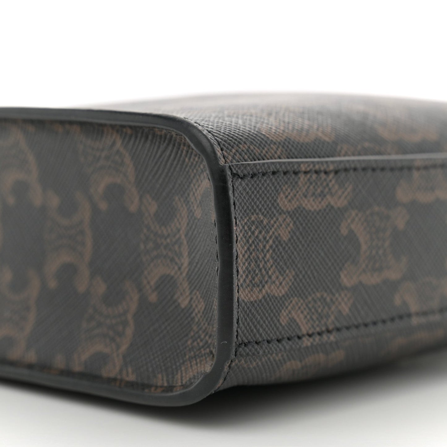 This is an authentic CELINE Triomphe Canvas Calfskin Mini Vertical Cabas in Tan. This sleek mini tote is crafted of Celine triomphe monogram coated canvas with a white Celine logo across the front. The bag features brown rolled leather top handles and an optional shoulder strap. The top is open to a brown fabric interior.Follow this item for alerts. Celine is a registered trademark of Celine. FASHIONPHILE is not affiliated with Celine.