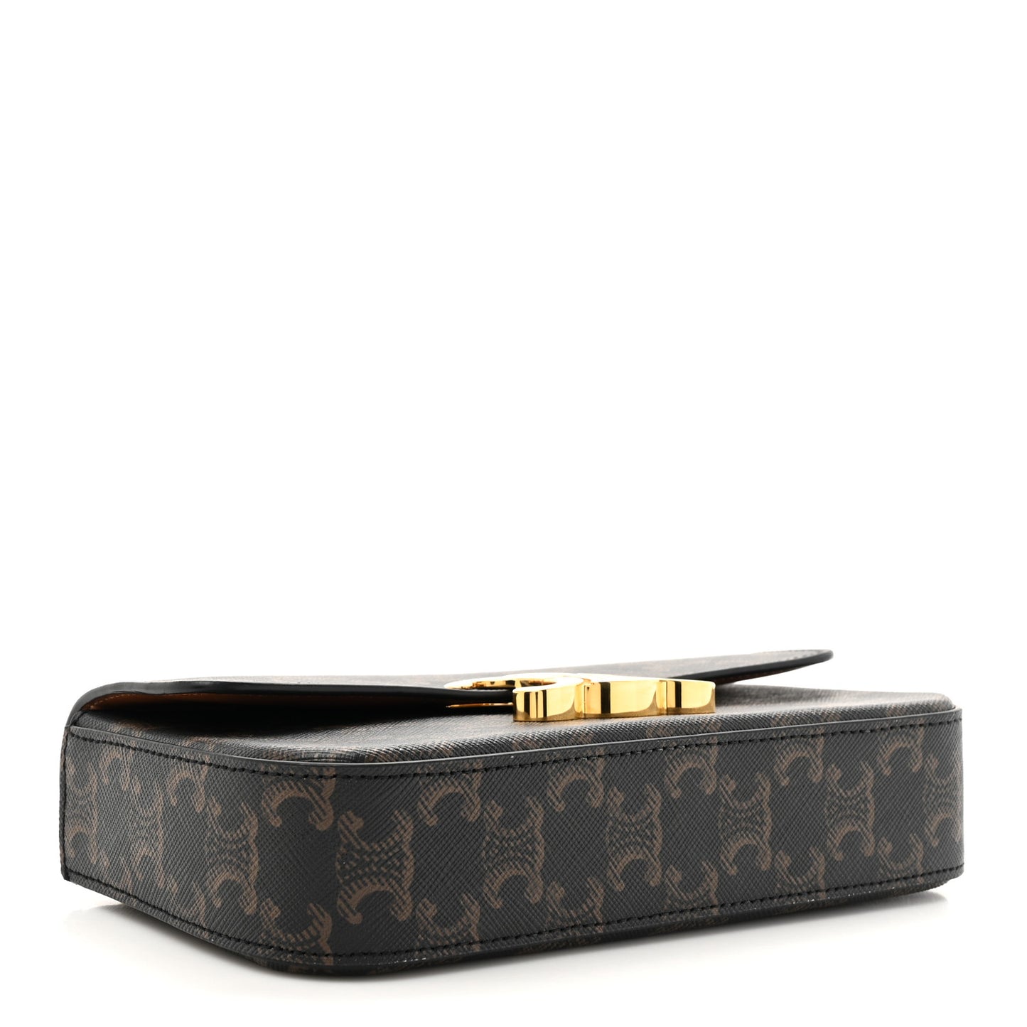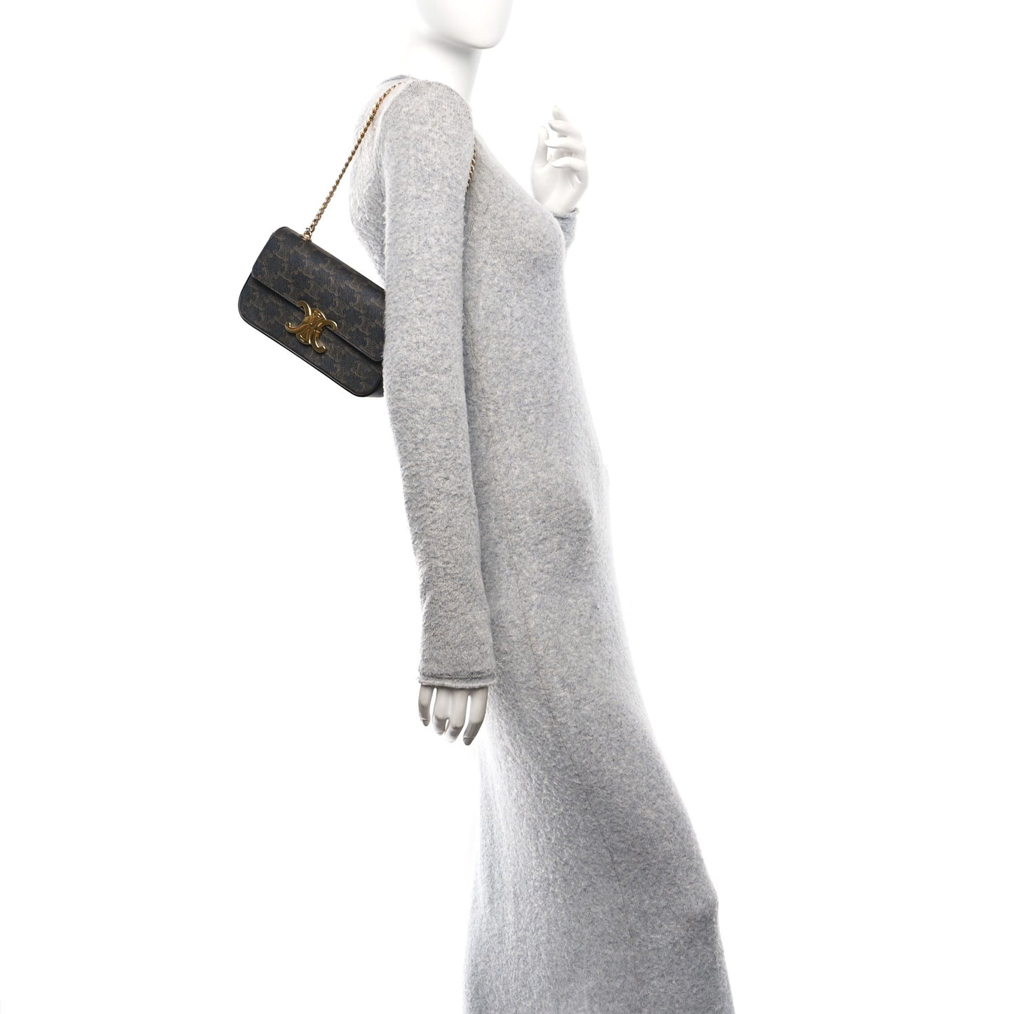This is an authentic CELINE Triomphe Canvas Chain Shoulder Bag in Tan. This chic shoulder bag is crafted of triomphe printed canvas in brown. The bag features a gold chain strap and a matching gold press lock on the crossover flap that opens to a brown leather interior with a patch pocket.Follow this item for alerts. Celine is a registered trademark of Celine. FASHIONPHILE is not affiliated with Celine.