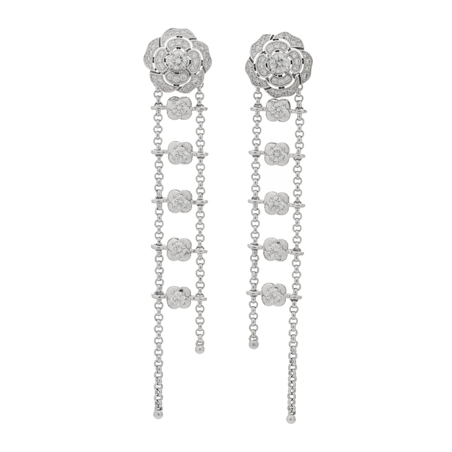 This is an authentic CHANEL 18K White Gold Diamond Bouton de Camelia Transformable Earrings. The earrings are crafted of 18 karat white gold and feature camellia flower motifs with detachable chain drops hanging below, set with approximately 1.98 total carat weight of diamonds.Follow this item for alerts. Chanel is a registered trademark of Chanel. FASHIONPHILE is not affiliated with Chanel.