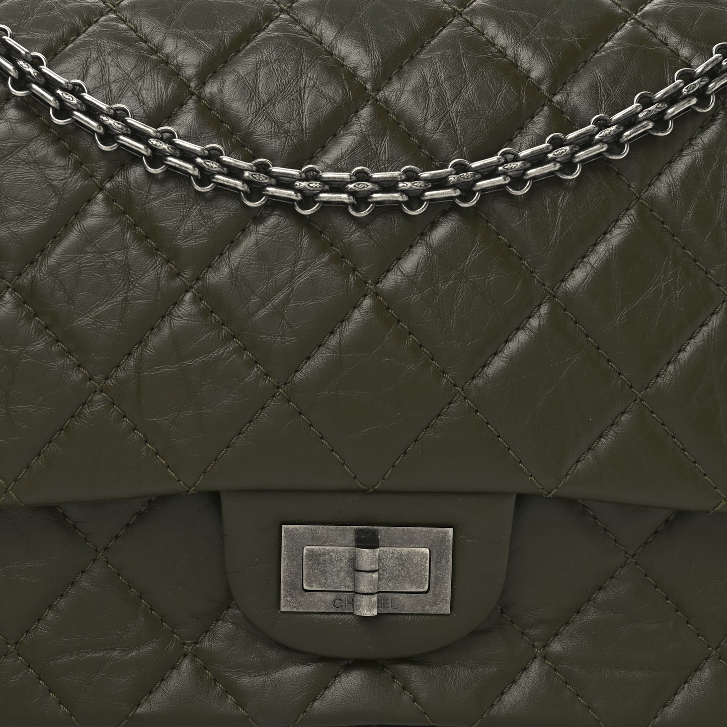 This is an authentic CHANEL Aged Calfskin Quilted 2.55 Reissue 227 Flap in Dark Green. This stylish shoulder bag is beautifully crafted of diamond quilted aged calfskin leather in olive green. The bag features ruthenium reissue chain shoulder straps and ruthenium squared mademoiselle turn lock. This opens to a matching leather interior with a second flap and pockets.Follow this item for alerts. Chanel is a registered trademark of Chanel. FASHIONPHILE is not affiliated with Chanel.