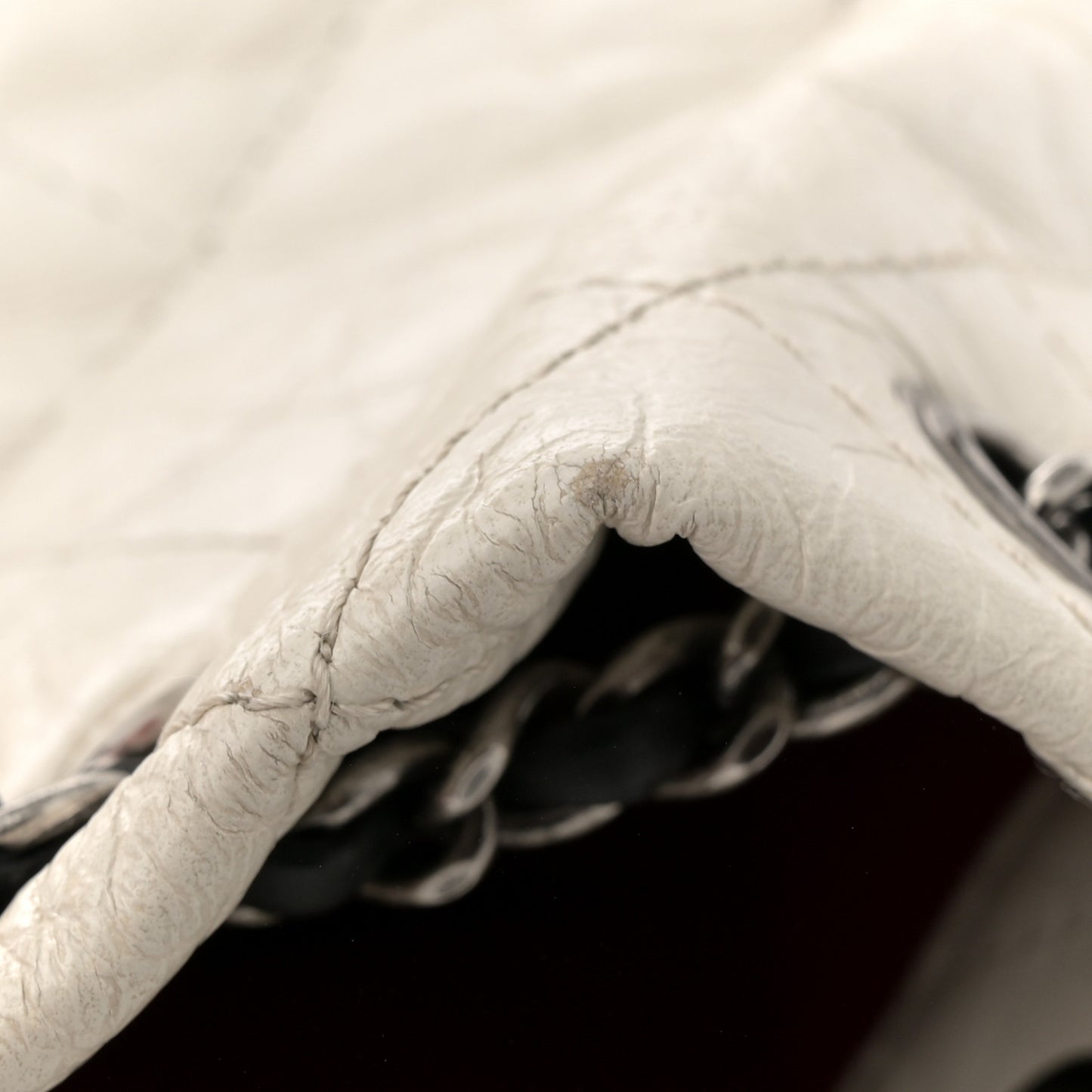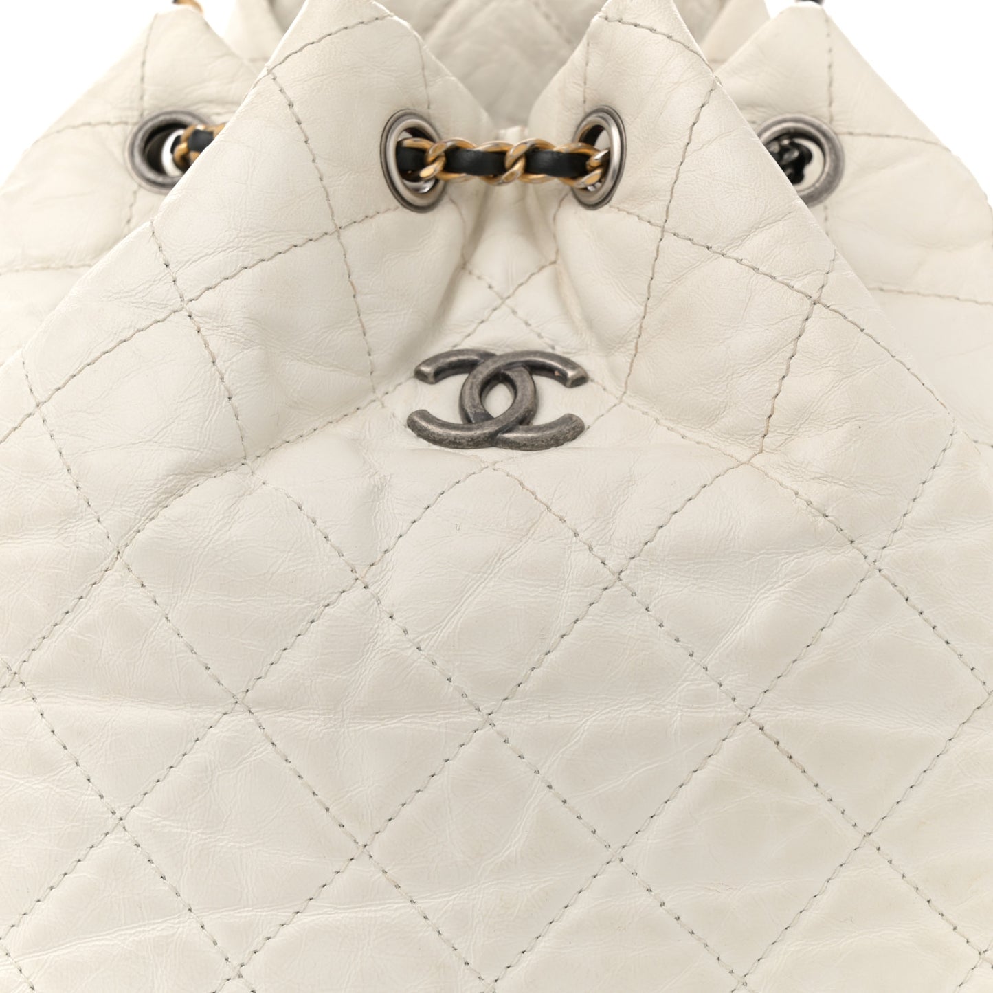 This is an authentic CHANEL Aged Calfskin Quilted Gabrielle Backpack in Black and White. This chic backpack is crafted of diamond-stitched textured aged white calfskin leather. The shoulder bag features a smooth black leather base, a ruthenium CC logo, ruthenium aged, polished gold and silver chain threaded leather shoulder straps, and an open top. This opens to a spacious red fabric interior with a patch pocket.Follow this item for alerts. Chanel is a registered trademark of Chanel. FASHIONPHILE is not affiliated with Chanel.