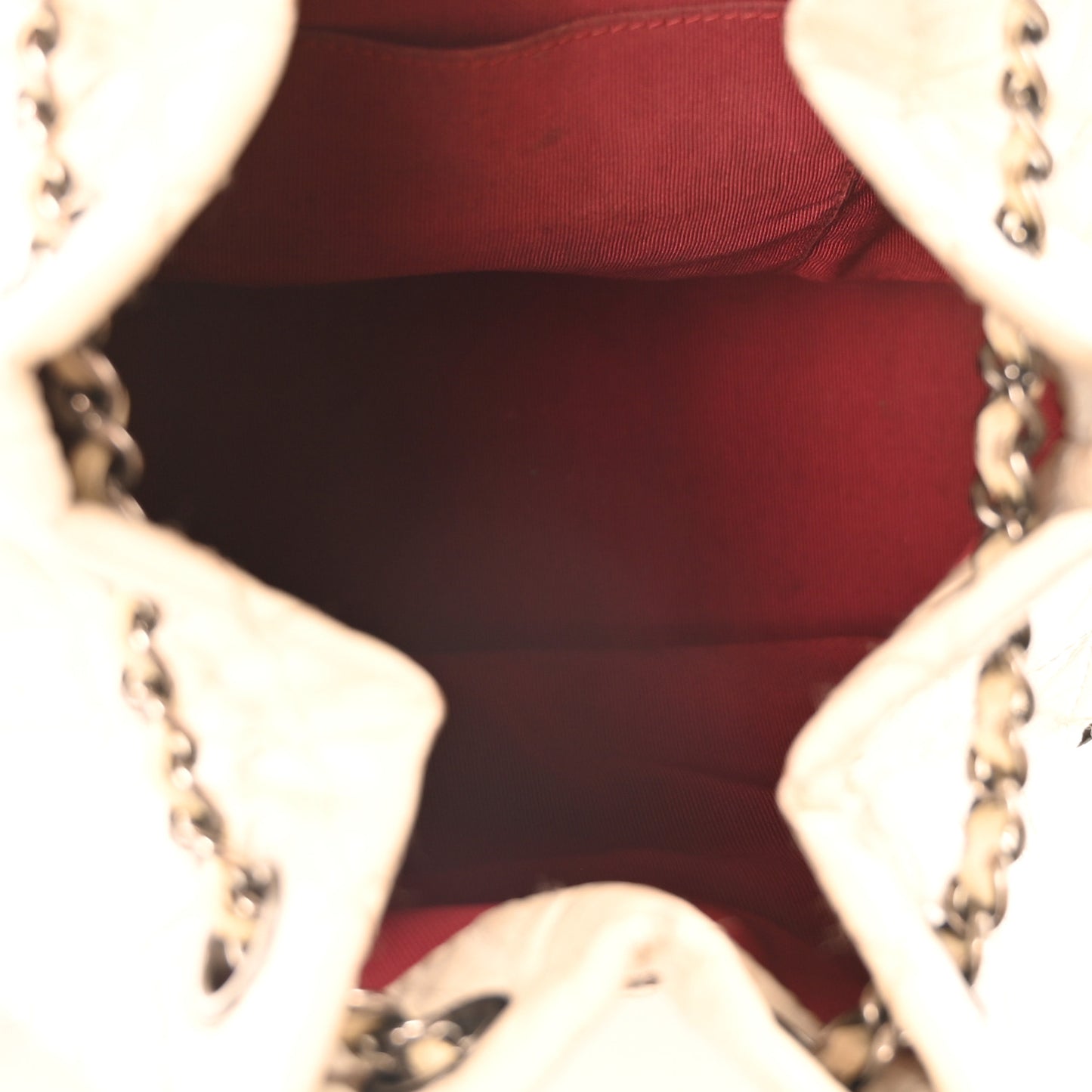This is an authentic CHANEL Aged Calfskin Quilted Small Gabrielle Backpack in Black and White. This chic backpack is crafted of diamond-stitched textured aged white calfskin leather. The shoulder bag features a smooth black leather base, a ruthenium CC logo, ruthenium aged, polished gold and silver chain threaded leather shoulder straps, and an open top. This opens to a spacious deep red fabric interior with a patch pocket.Follow this item for alerts. Chanel is a registered trademark of Chanel. FASHIONPHILE is not affiliated with Chanel.