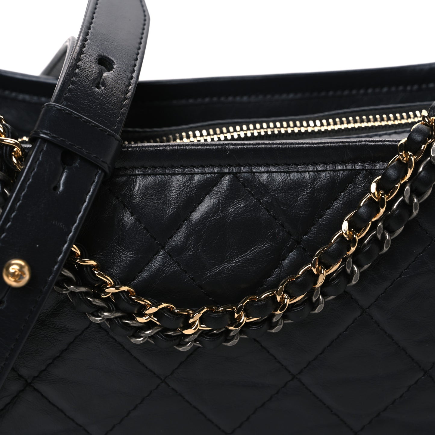 This is an authentic CHANEL Aged Calfskin Quilted Small Gabrielle Hobo in Dark Grey. This chic shoulder bag is crafted of diamond-stitched aged calfskin leather in dark grey. it features a sturdy smooth calfskin base, and thin gold-tone, ruthenium, and polished silver chain link leather threaded shoulder straps with a shoulder pad. The top zipper features an aged gold and ruthenium Chanel CC zipper pull and opens to a spacious grey fabric interior with zipper and patch pockets.Follow this item for alerts. Chanel is a registered trademark of Chanel. FASHIONPHILE is not affiliated with Chanel.