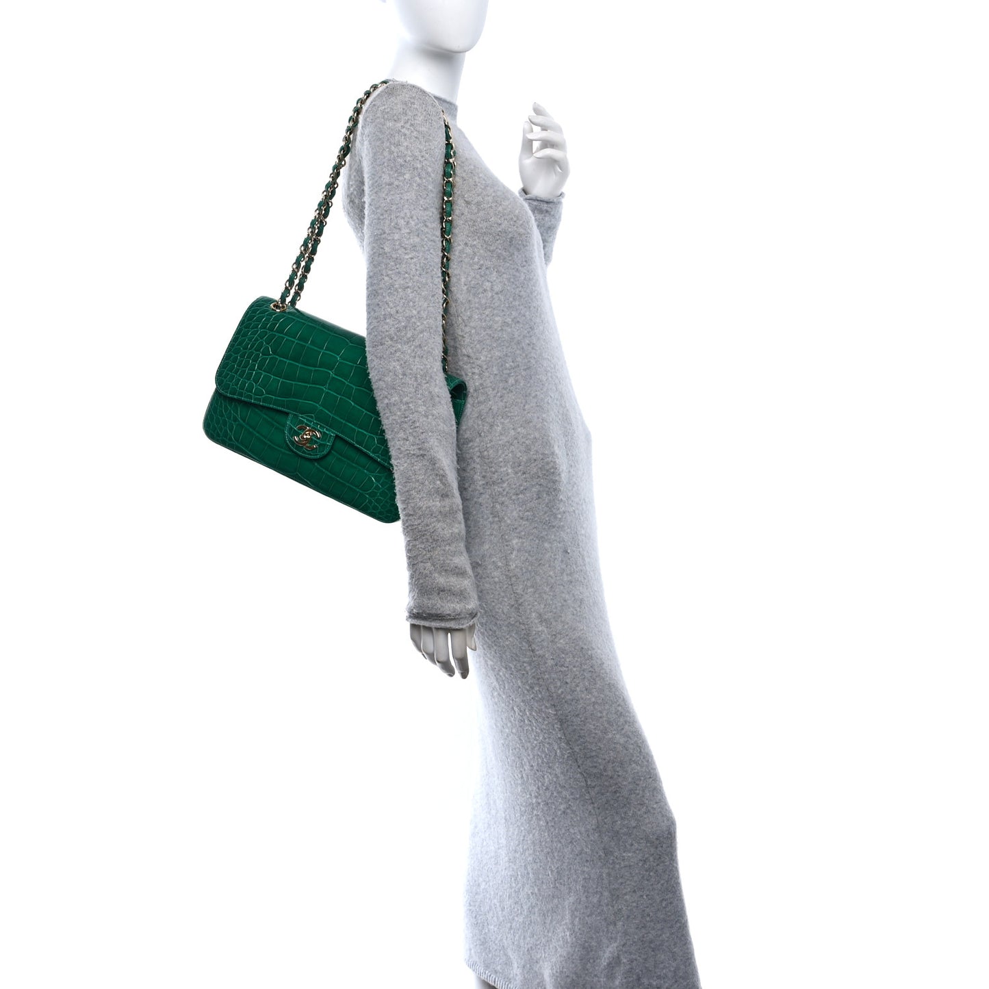 This is an authentic CHANEL Alligator Jumbo Double Flap in Green. This shoulder bag is crafted of green alligator and gold hardware. The flap opens to a green leather interior.Follow this item for alerts. Chanel is a registered trademark of Chanel. FASHIONPHILE is not affiliated with Chanel.