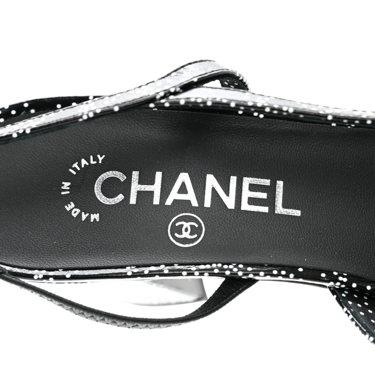 This is an authentic pair of CHANEL Calfskin Camellia Printed Cap Toe CC Slingback Pumps size 39.5 Black and White. These chic slingback pumps are crafted of printed calfskin leather in black with Chanel CC logos, camellias and lucky clover motifs. They feature a rounded black leather cap toe and a small silver Chanel logo on the heel.Follow this item for alerts. Chanel is a registered trademark of Chanel. FASHIONPHILE is not affiliated with Chanel.