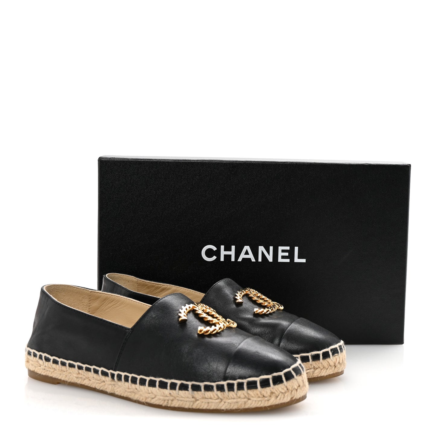 This is an authentic pair of CHANEL Calfskin Chain CC Espadrilles size 35 in Black. These espadrilles have a midsole with uppers of black calfskin leather and they feature a gold textured Chanel CC logo at the uppers.Follow this item for alerts. Chanel is a registered trademark of Chanel. FASHIONPHILE is not affiliated with Chanel.