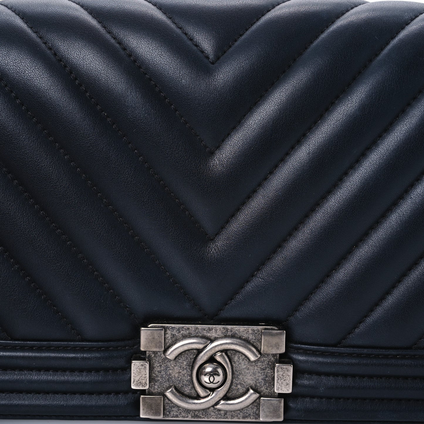 This is an authentic CHANEL Calfskin Chevron Quilted Medium Boy Flap in Black. This chic shoulder bag is crafted of chevron-quilted calfskin leather in black. It features a silver chain-link shoulder strap with a leather shoulder pad and a matching boy CC push lock on the front. This opens the bag to a grey fabric interior with a patch pocket.Follow this item for alerts. Chanel is a registered trademark of Chanel. FASHIONPHILE is not affiliated with Chanel.