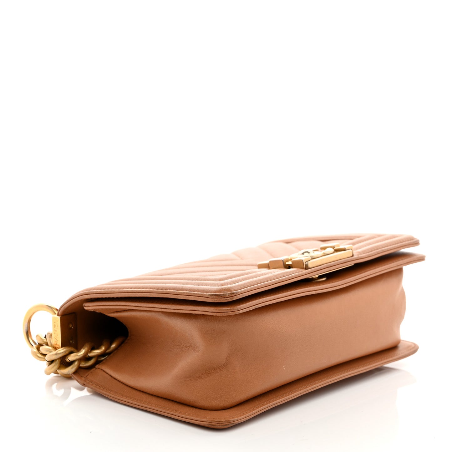 This is an authentic CHANEL Calfskin Chevron Quilted Small Boy Flap in Dark Beige. This chic shoulder bag is crafted of calfskin leather in beige. The shoulder bag features an aged gold chain link shoulder strap with a leather shoulder pad, a chevron quilted flap with a linear-quilted border and an aged gold Boy CC push lock. The flap opens to a beige leather interior with a patch pocket.Follow this item for alerts. Chanel is a registered trademark of Chanel. FASHIONPHILE is not affiliated with Chanel.