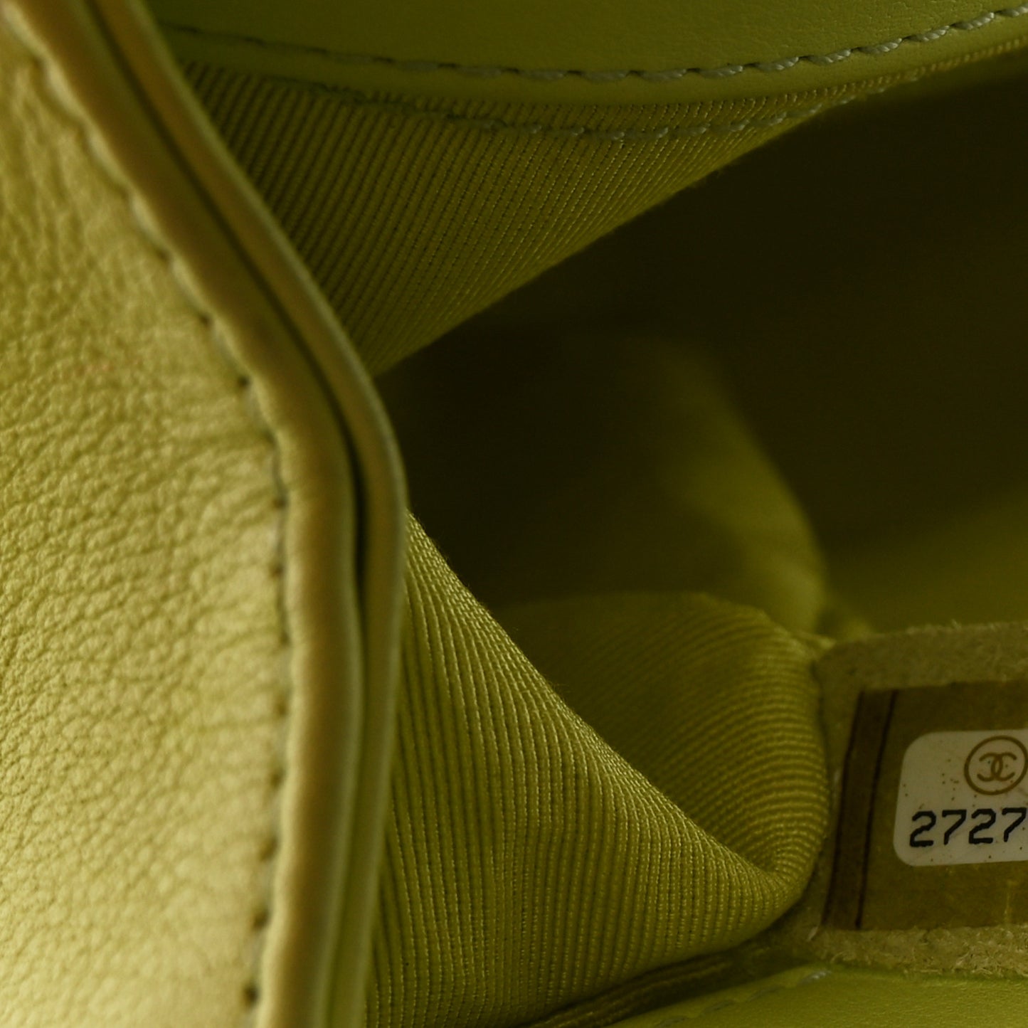 This is an authentic CHANEL Calfskin Chevron Quilted Small Boy Flap in Light Green. This chic shoulder bag is crafted of chevron quilted calfskin leather with a structured rectangular silhouette in light green. The bag features a light gold chain link shoulder strap with a leather shoulder pad and a CC boy light gold press lock. This opens the front flap to a light green fabric interior with a single patch pocket.Follow this item for alerts. Chanel is a registered trademark of Chanel. FASHIONPHILE is not affiliated with Chanel.